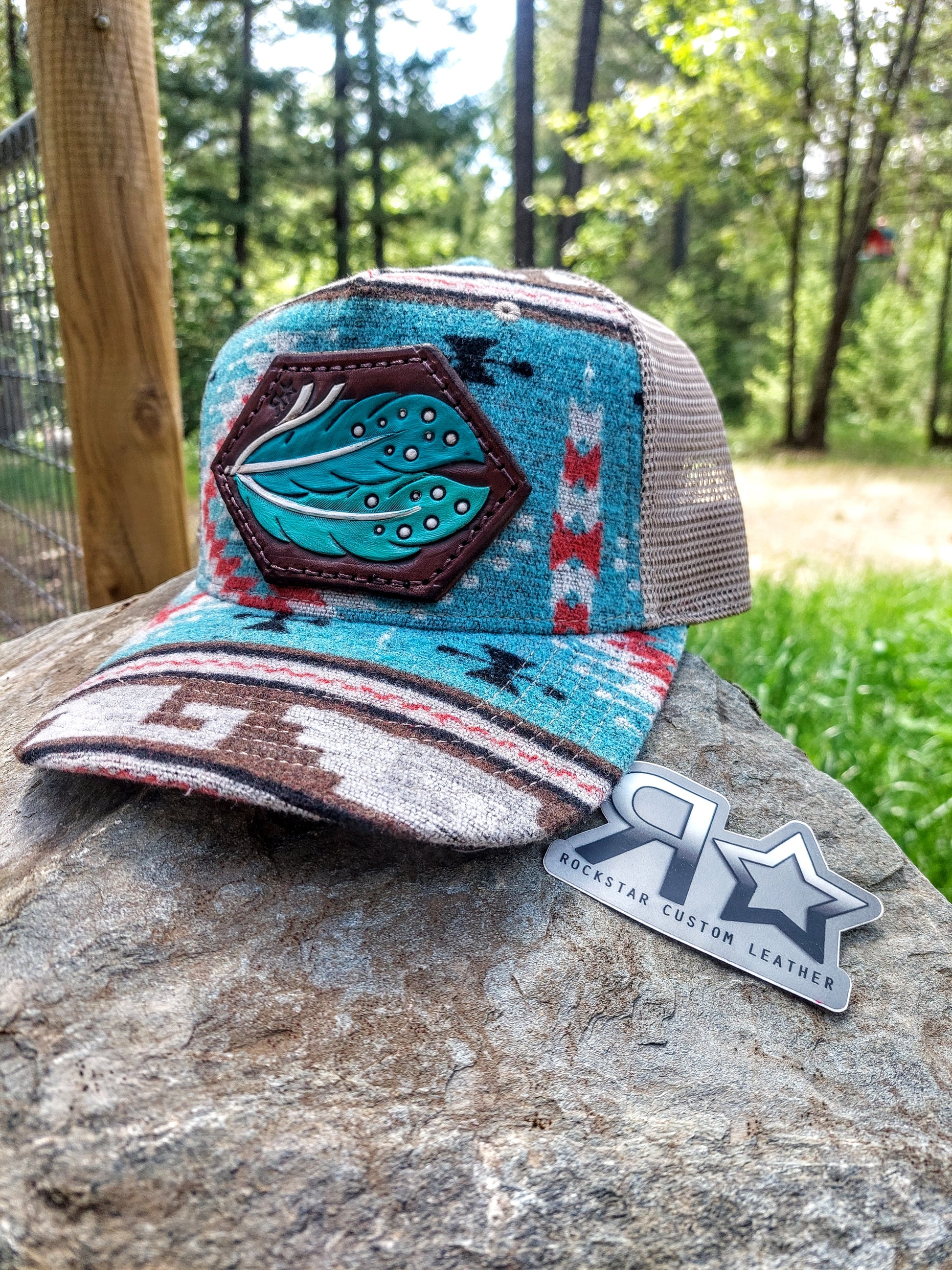 This one will turn heads! Gorgeous aztec pattern wool front, mesh back hat. Snapback. It has a gorgeous hand tooled, hand painted turquoise feather patch. Don't let this one pass you by! It is one of a kind and so classy!