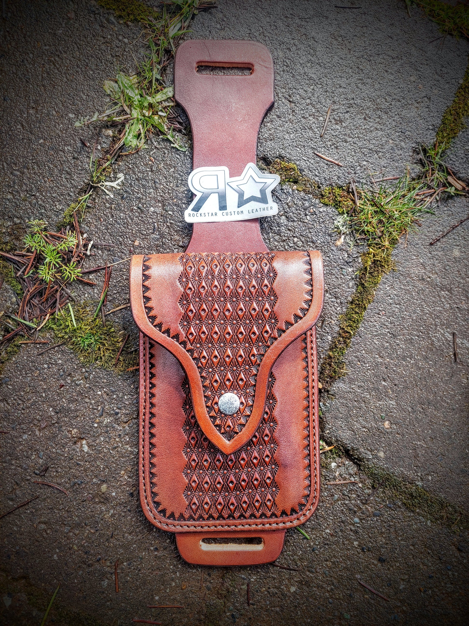 Beautiful geometric tooled phone pocket, holster, case, bag whatever you like to call them. This style is made to loop through your back cinch D ring for a super secure fit. Holds phones up to 4"x7"