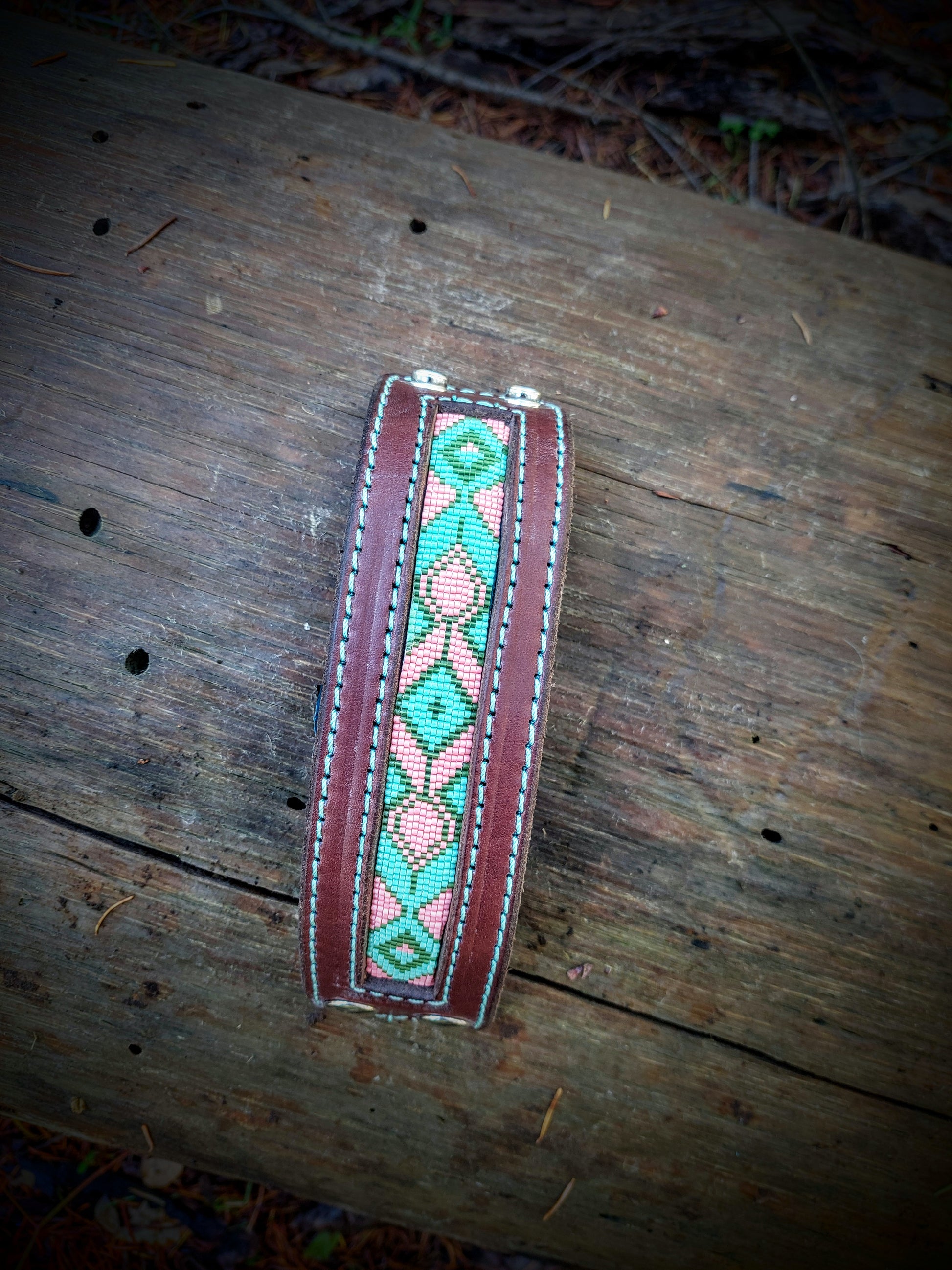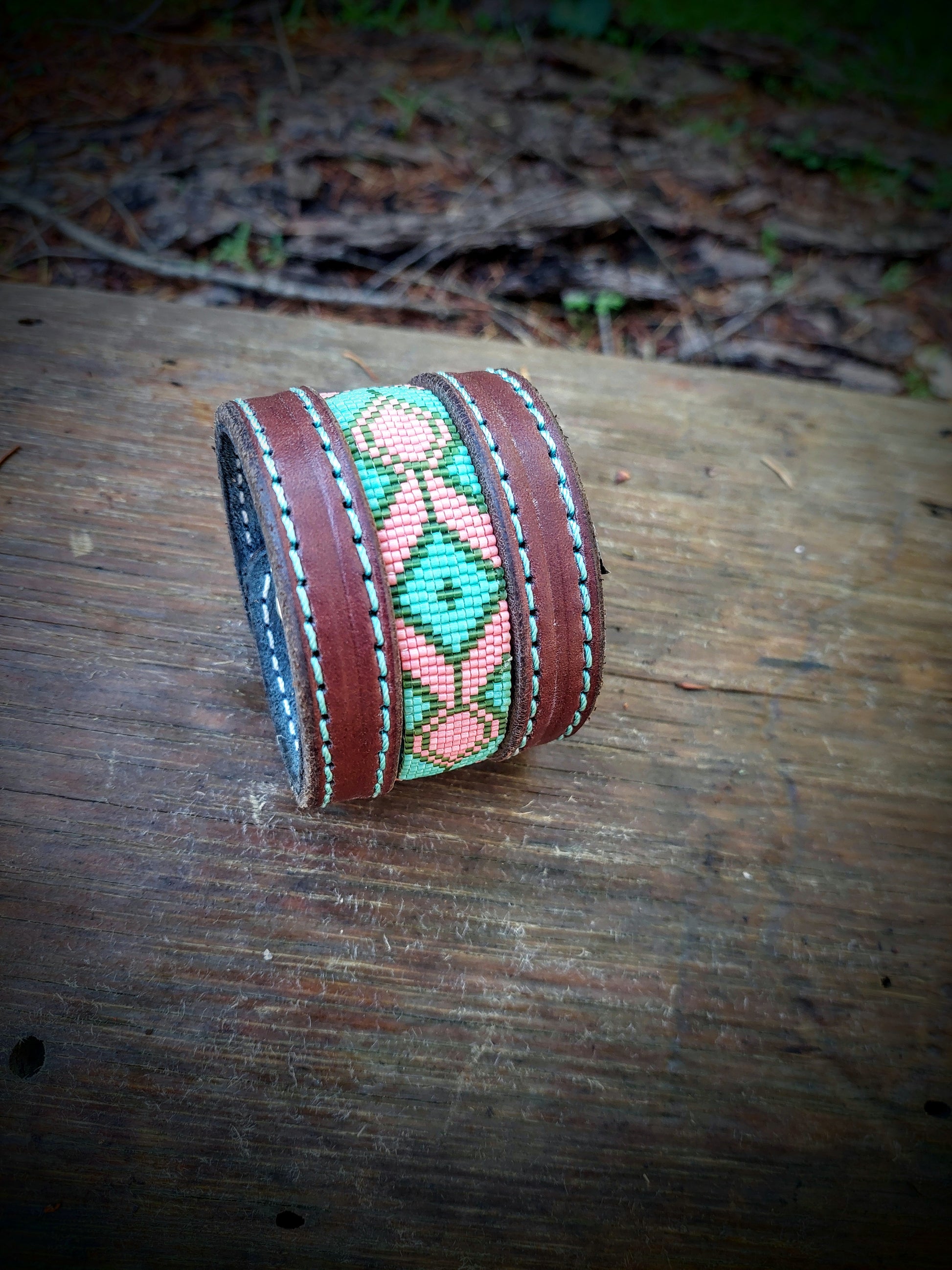 Absolutely gorgeous hand beaded cuff on chocolate leather