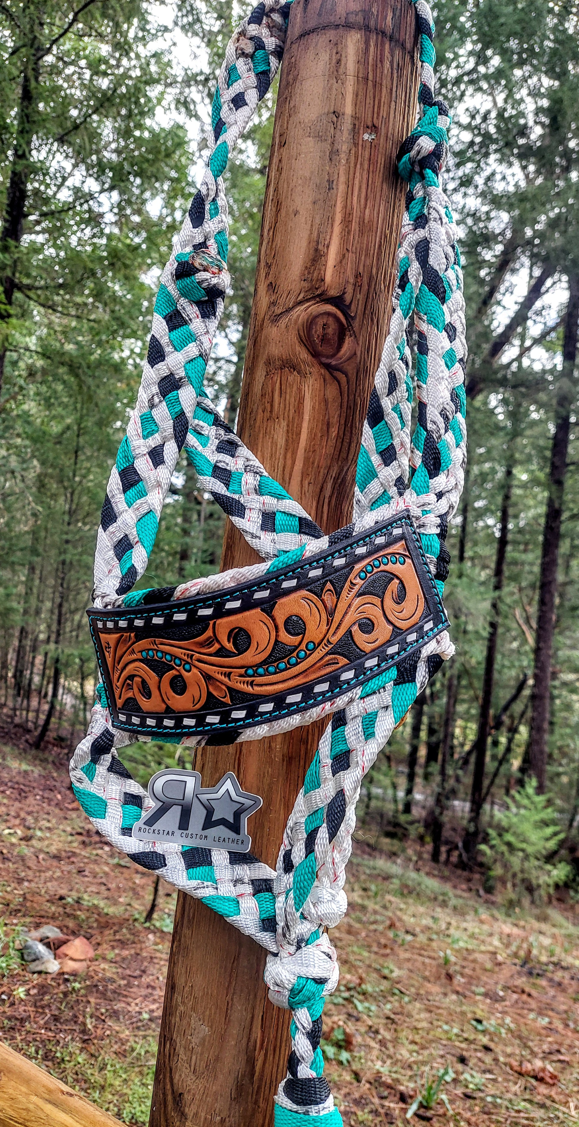 One of a kind! Chunky style braided muletape halter in turquoise, black and white with a removable lead rope. Hand tooled floral noseband with white buckstitch. Dont miss out on this flashy halter! You'll be the talk of the town!