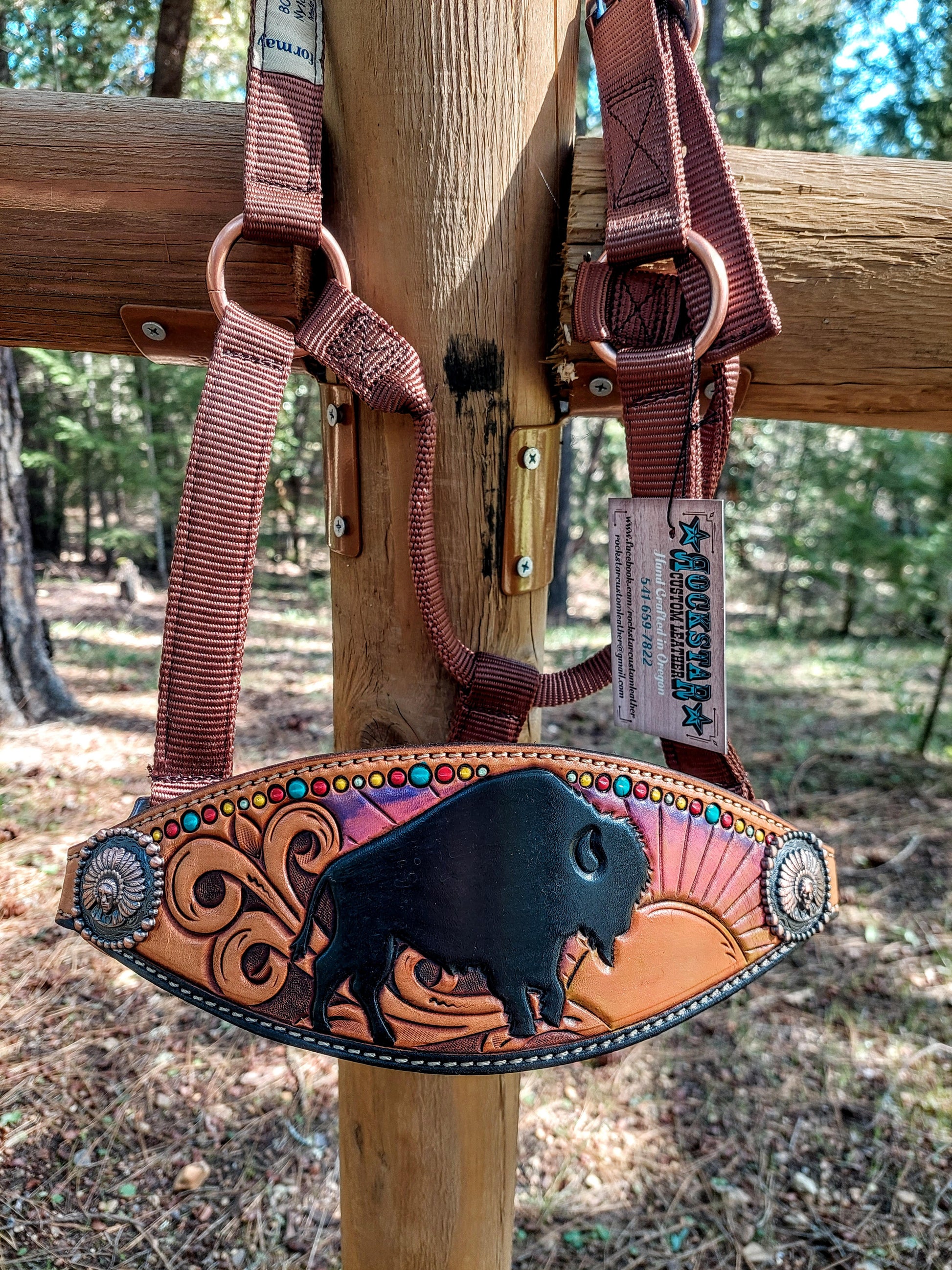 Beautifully hand tooled and hand painted bronc halter. Featuring a buffalo silhouette and a gorgeous sunset, amongst some floral tooling. Hand painted colorful dot border along the top. This one is sure to turn heads! Mounted on a Formay brand, average sized (800-1000lb) brown nylon halter with copper hardware. Indian head copper conchos. An absolutely stunning combination, and a must have!