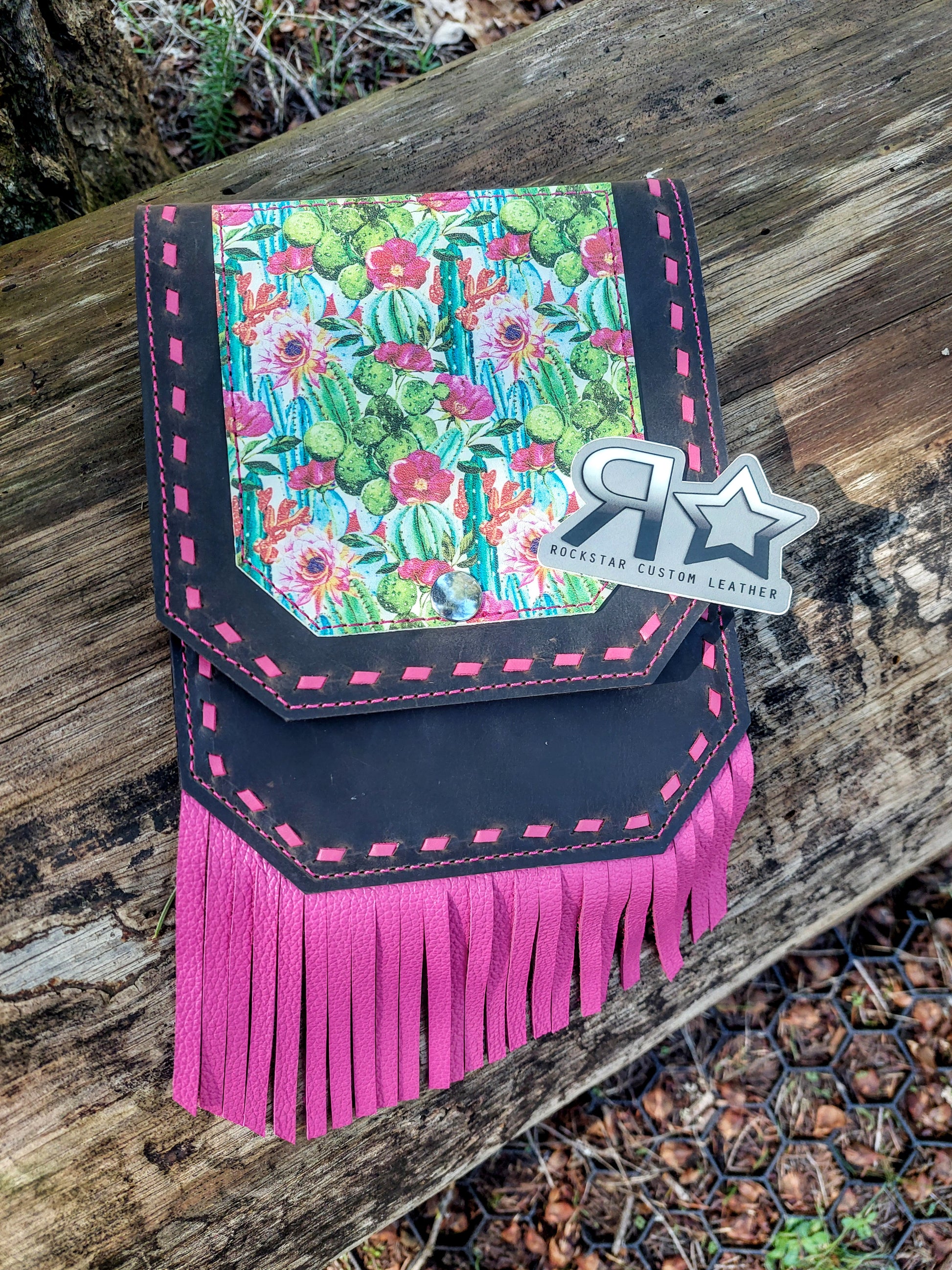 Beautiful cactus print patch on the front, with hot pink buckstitch and fringe, and dark chocolate body. Flap top with a snap closure. These are designed to attach to the back cinch tugs on your saddle by slipping through the slot in the back, and then tying at the top. These are made to hold your phones, keys, baby powder, etc. Interior pocket dimensions are approximately 6"x7"