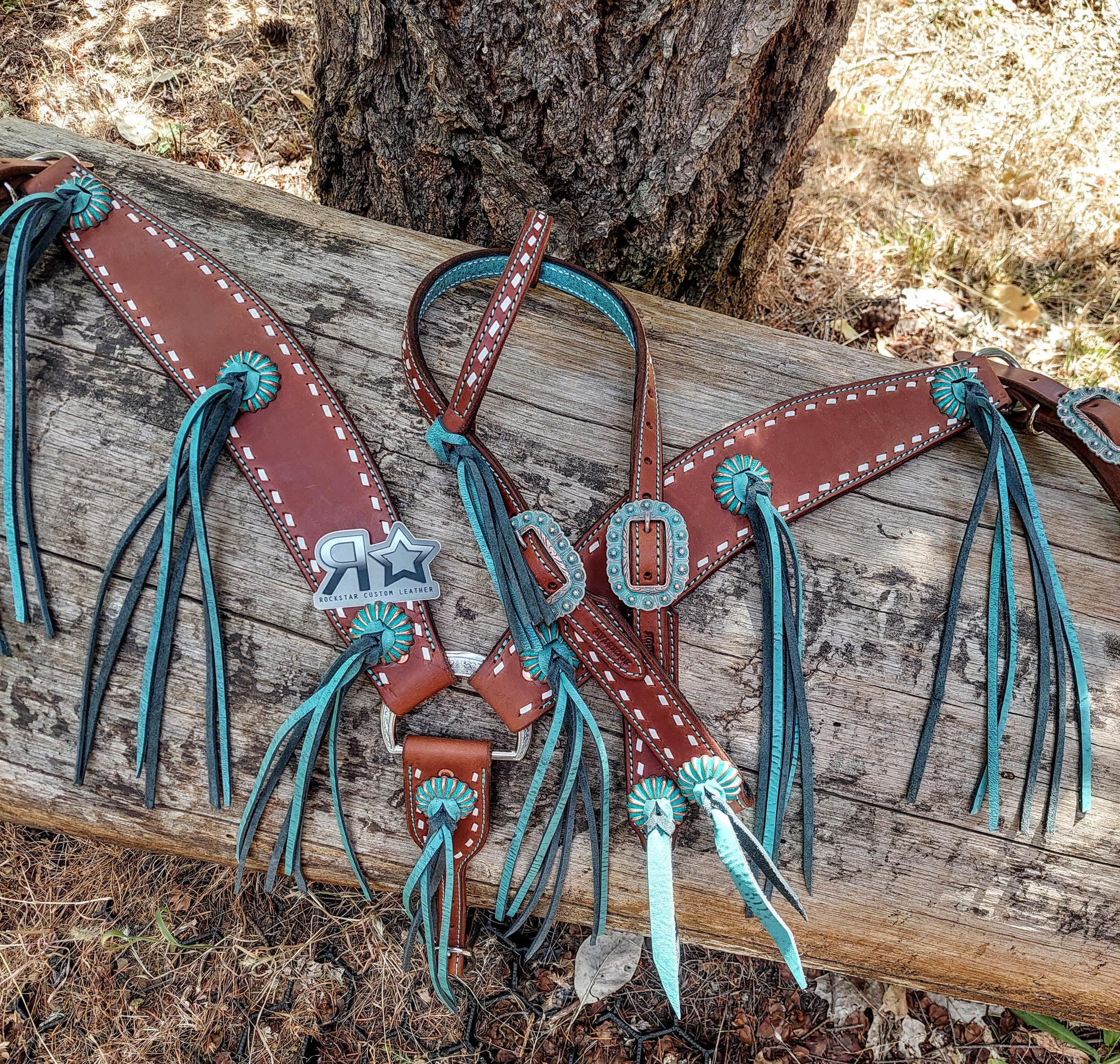 Don't miss out on this one of a kind, gorgeous tack set! Matching one ear headstall and breastcollar made with chocolate leather, white buckstitch, light turquoise/mint stitching, copper patina hardware, and BEAUTIFUL turquoise/mint fringe/ties. This set will turn heads, guaranteed!