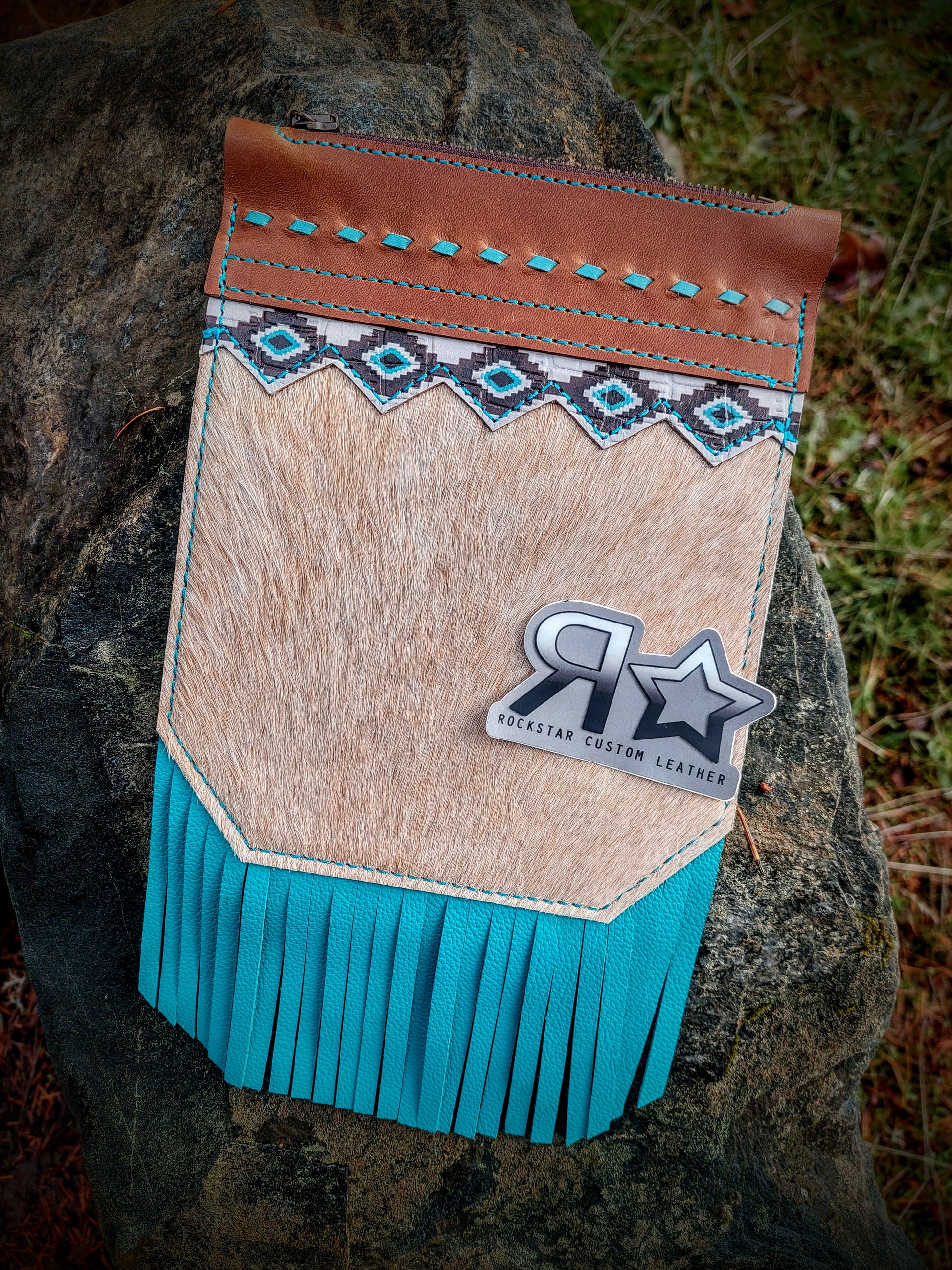 Genuine hair on cowhide front with turquoise fringe and buckstitch. Zip Top. These are designed to attach to the back cinch tugs on your saddle by slipping through the slot in the back, and then tying at the top. These are made to hold your phones, keys, baby powder, etc. Interior pocket dimensions are approximately 6"x7"