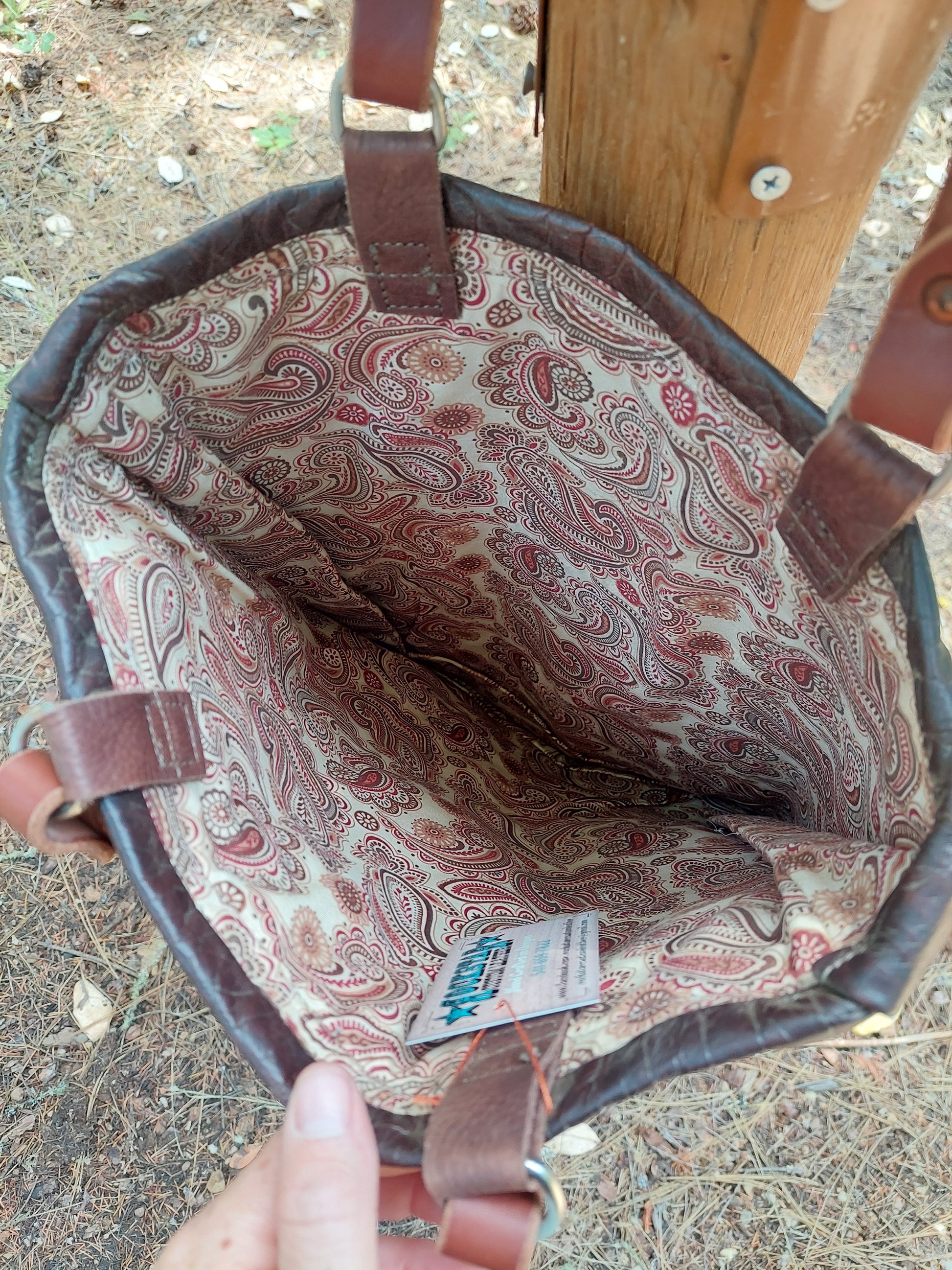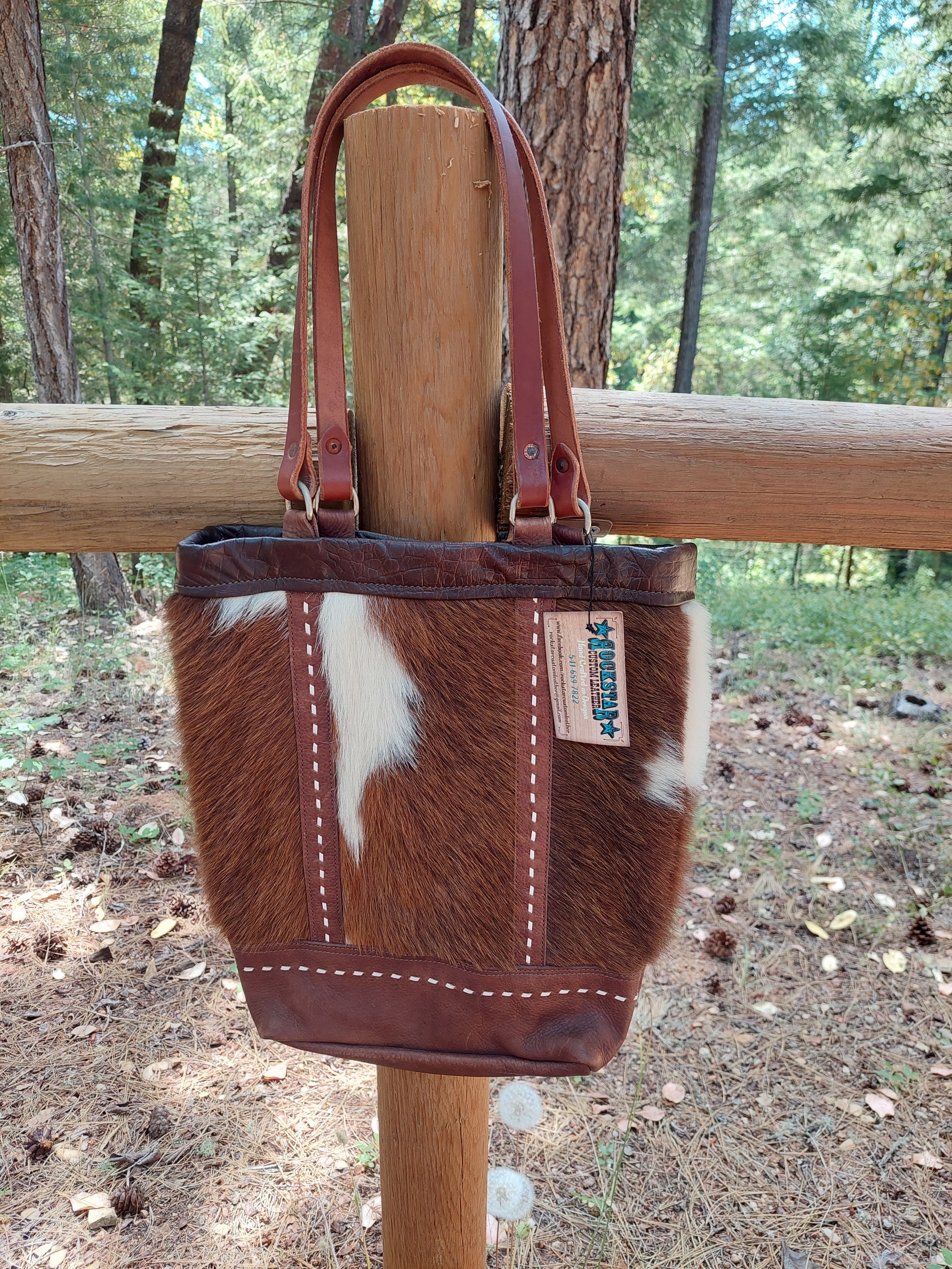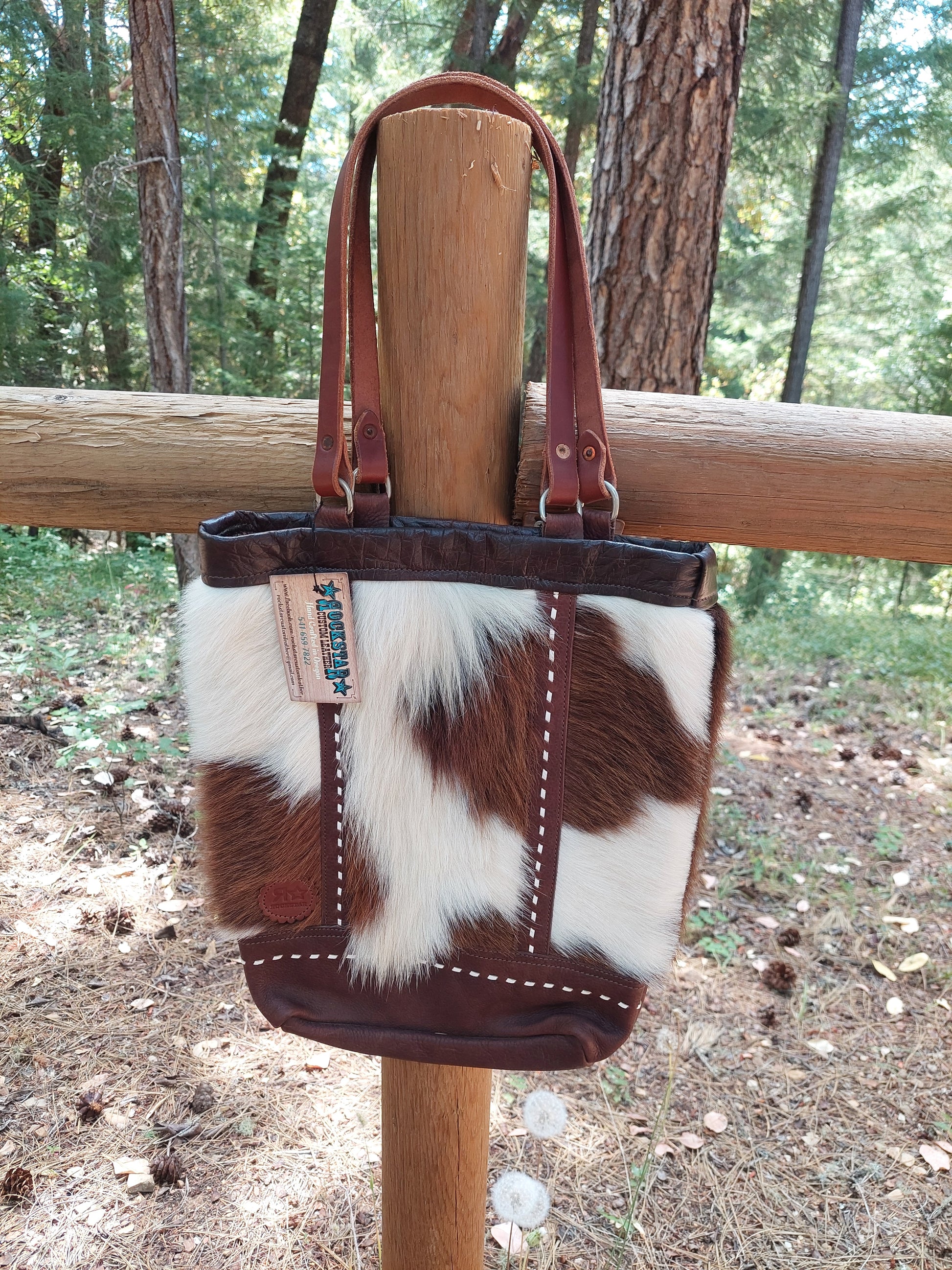 Absolutely adorable! This cowhide tote bag is amazing! Shoulder straps measure about 25" long. Chocolate leather with white buckstitch on front and back. Soft cowhide in a beautiful brown and white color. Very roomy! Bag measures about 13" wide by about 16" tall, with a 3" box bottom. Lined with a beautiful paisley print cotton on inside. No pockets. This tote bag will carry all that you need, and you'll get compliments with it on your shoulder. Dont pass this one up!