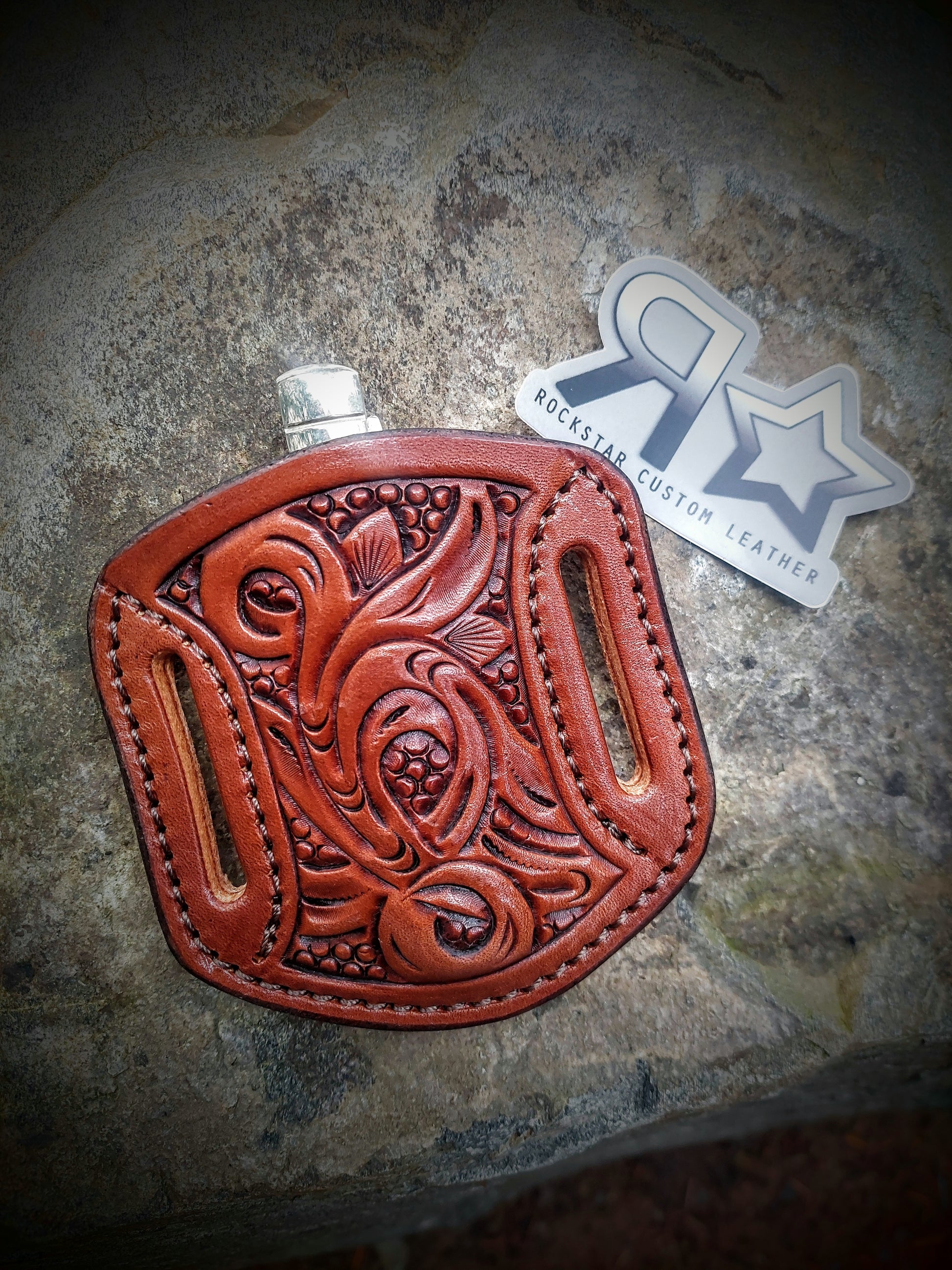 Beautifully tooled knife sheath with a Rough Ryder trapper knife included.