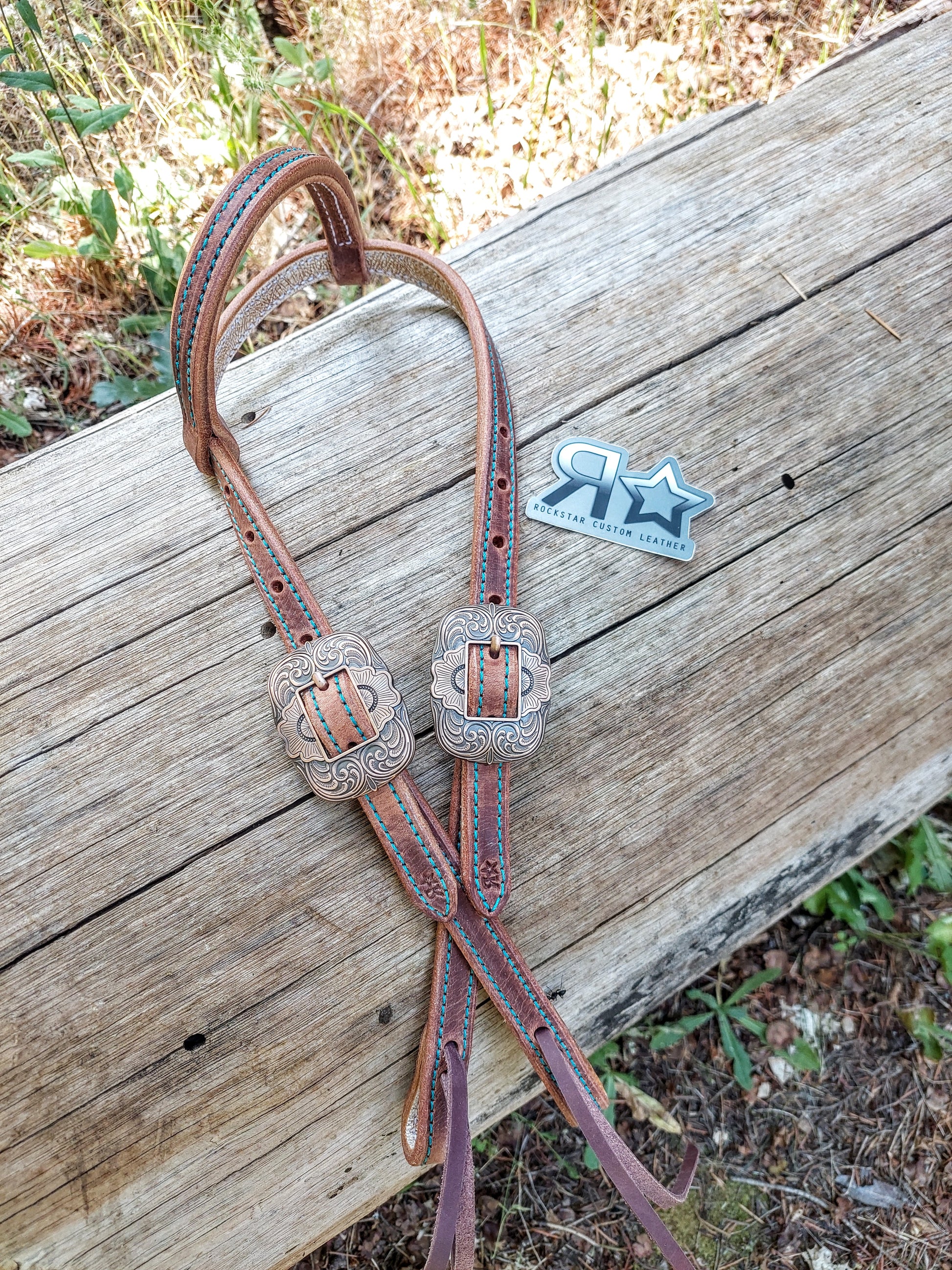 Gorgeous, buttery soft harness leather one ear headstall.  Turquoise stitch. Floral copper cart buckle. Perfect working headstall. 3/4" wide.