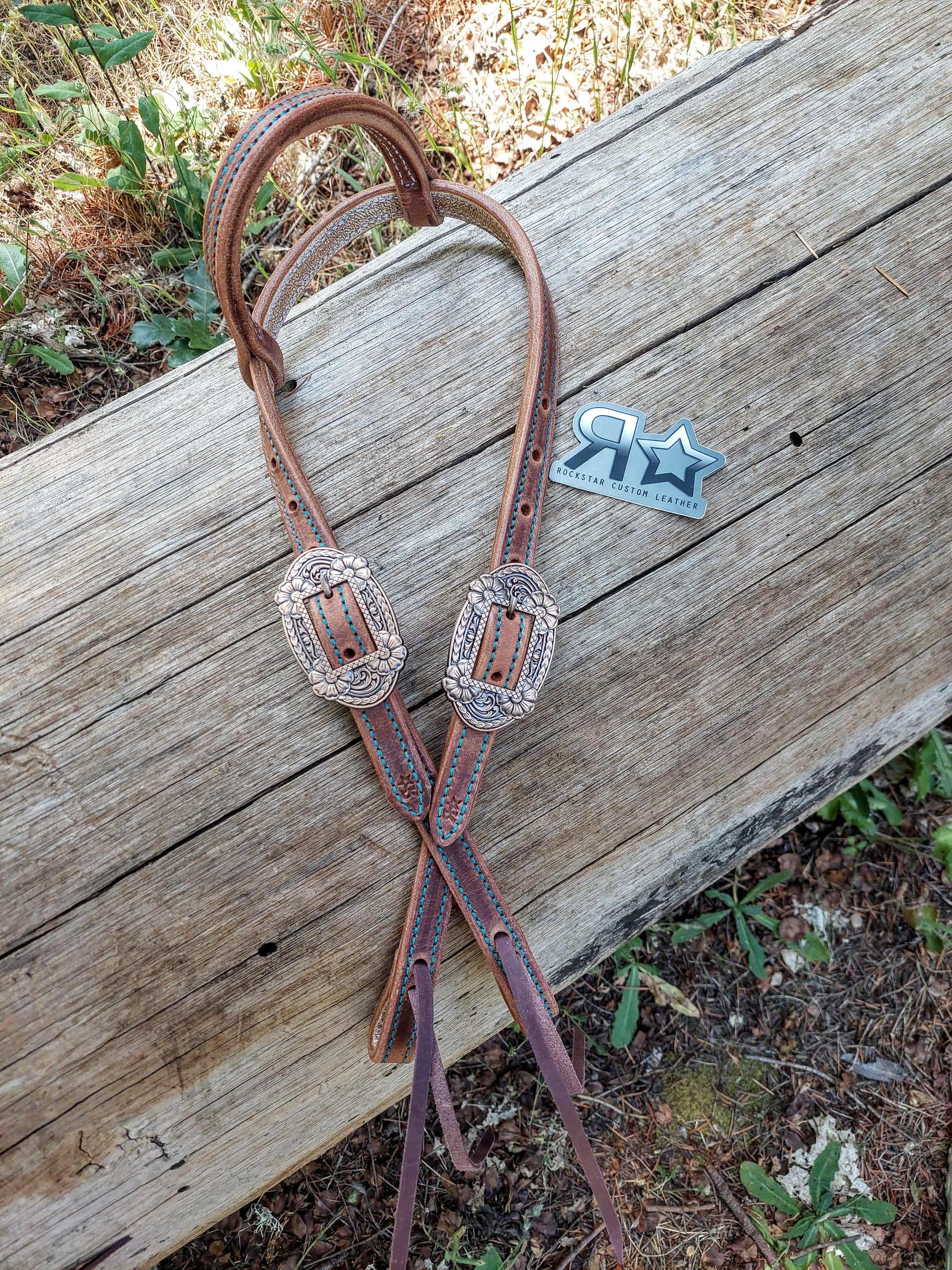 Gorgeous, buttery soft harness leather one ear headstall. Turquoise stitch. Floral copper cart buckle. Perfect working headstall. 3/4" wide.