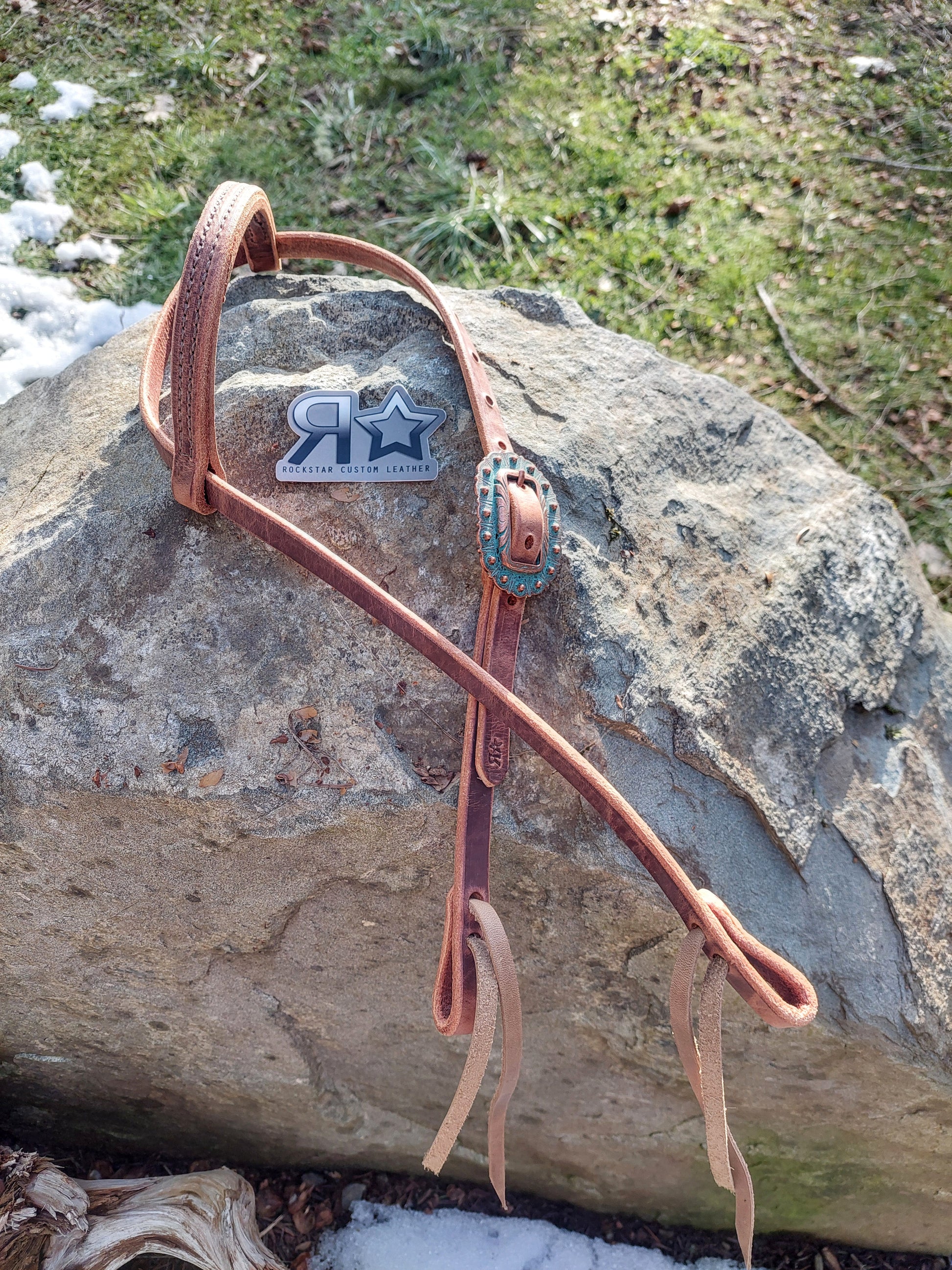 Gorgeous, buttery soft harness leather one ear headstall. Turquoise patina berry buckle. Perfect working headstall. 5/8" wide.