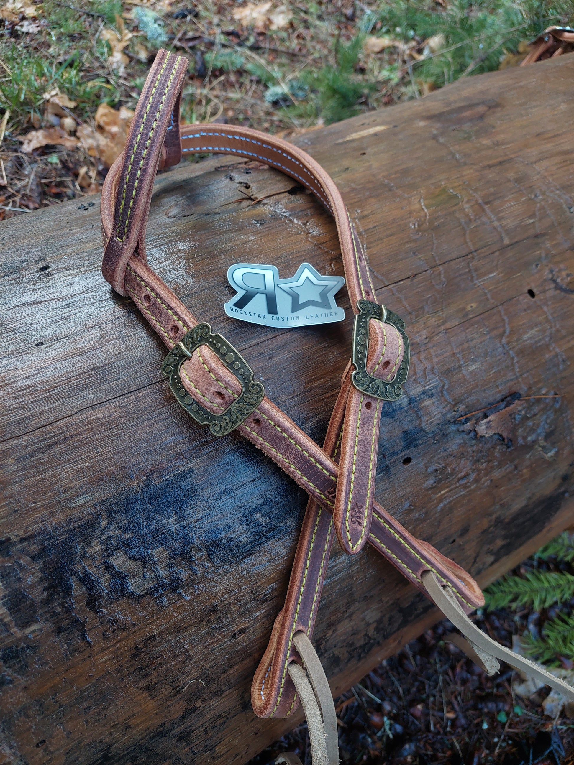 Gorgeous, buttery soft harness leather one ear headstall. Yellow stitch. Jeremiah Watt brass cart buckle. Perfect working headstall. 3/4" wide.