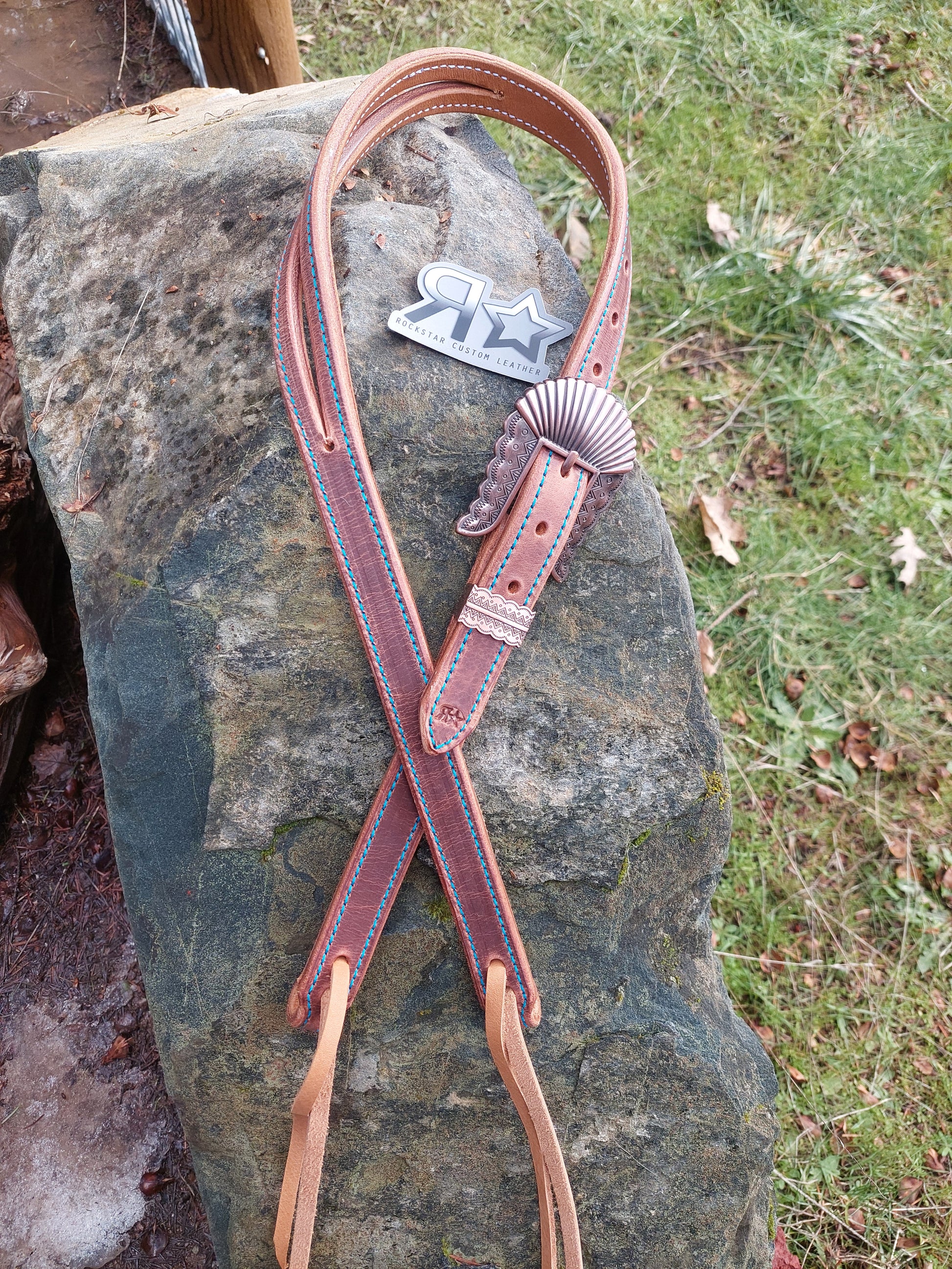 Gorgeous, buttery soft harness leather slit ear headstall. Two piece copper buckle. Perfect working headstall. 1" wide. Turquoise stitching.