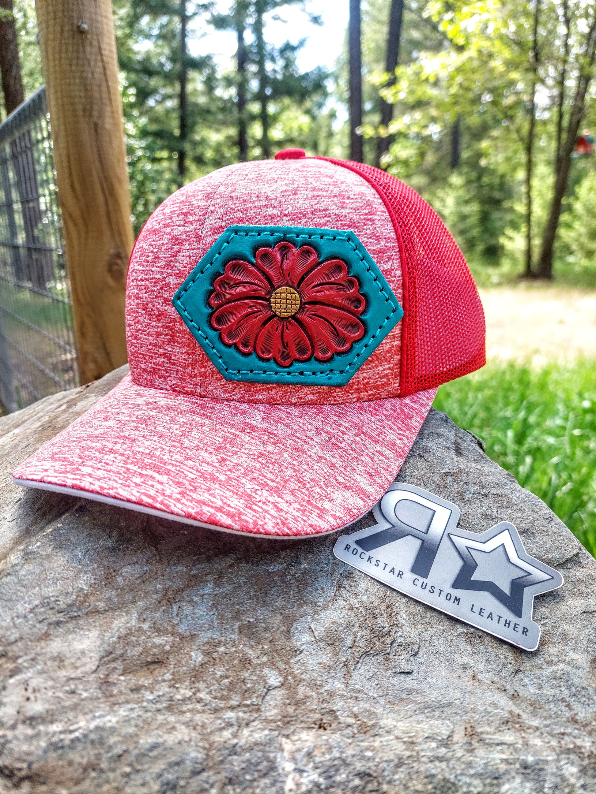 Gorgeous heather red, mesh back. Snapback hat. It has a gorgeous hand tooled, hand painted flower in red with a turquoise background.