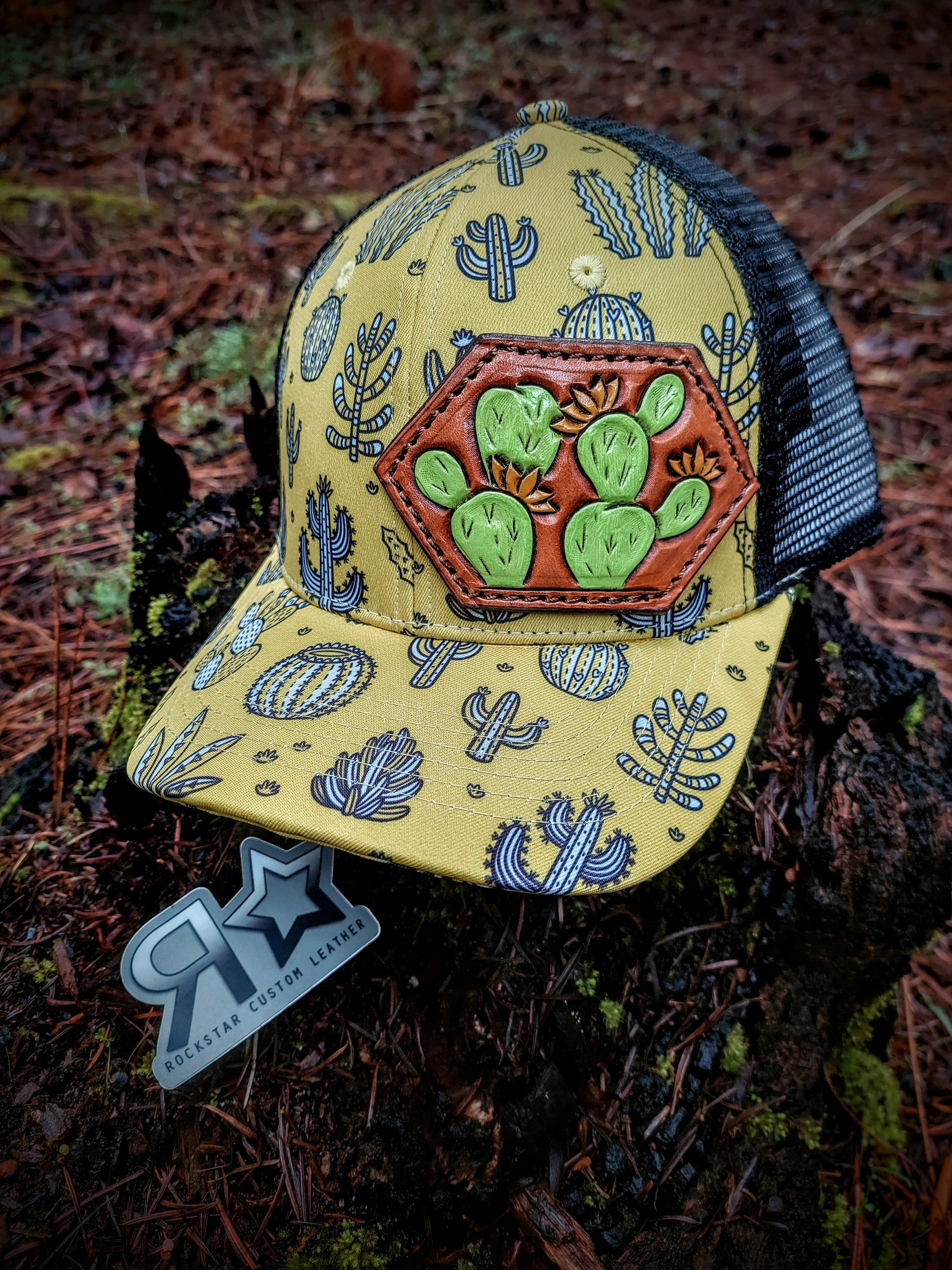 Gorgeous yellow cactus print snap back hat with hand tooled cactus leather patch.