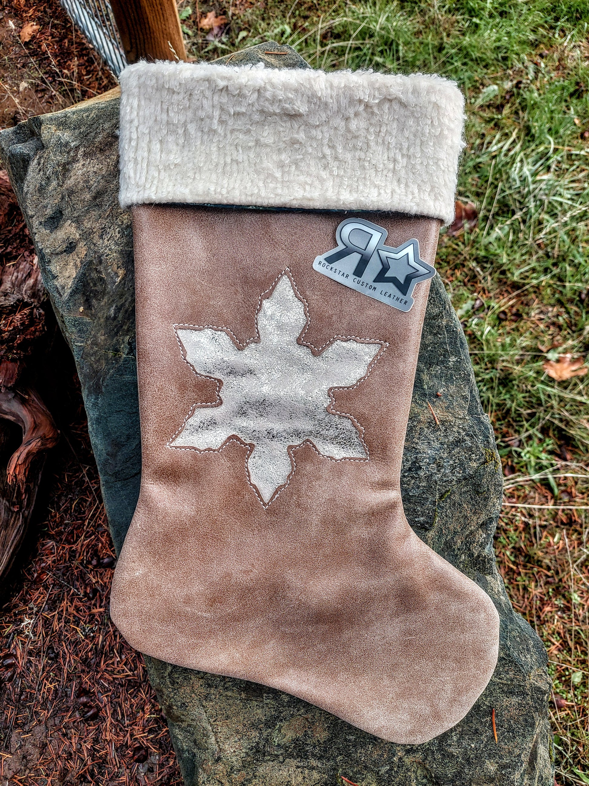 Make Christmas even more special with these gorgeous handmade leather stockings with leather inlay! This one is a snowflake cutout with faux fur on the top. These are good sized stockings, measuring approximately 16" tall by 8" wide, they can fit quite a few goodies inside! These make beautiful gifts that will last a lifetime! Fabric lined on the inside. Every stocking is one of a kind, not to be duplicated.