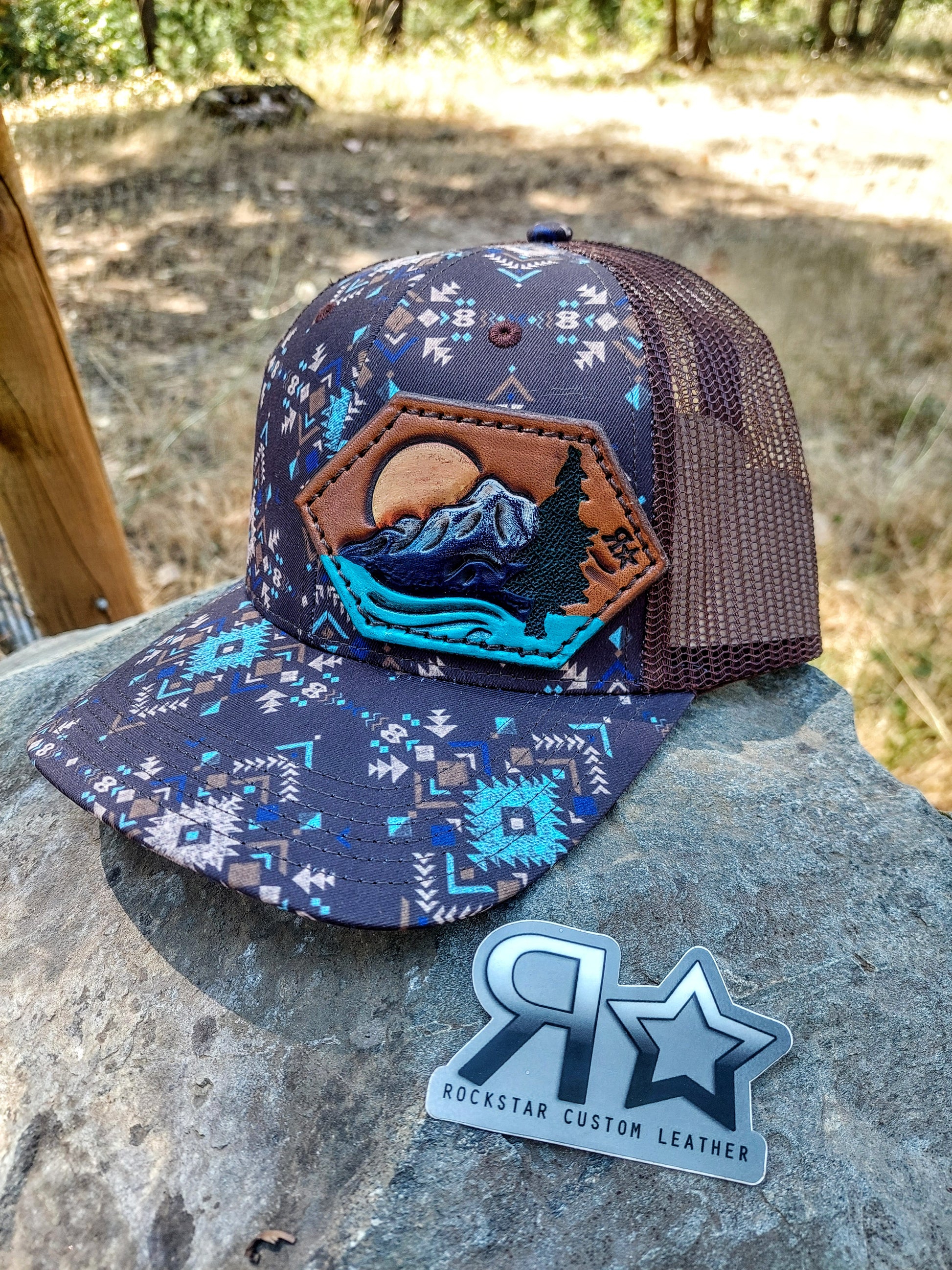 Gorgeous navy blue, aztec print snapback hat. It has a gorgeous hand tooled, hand painted leather patch with a mountain scene.