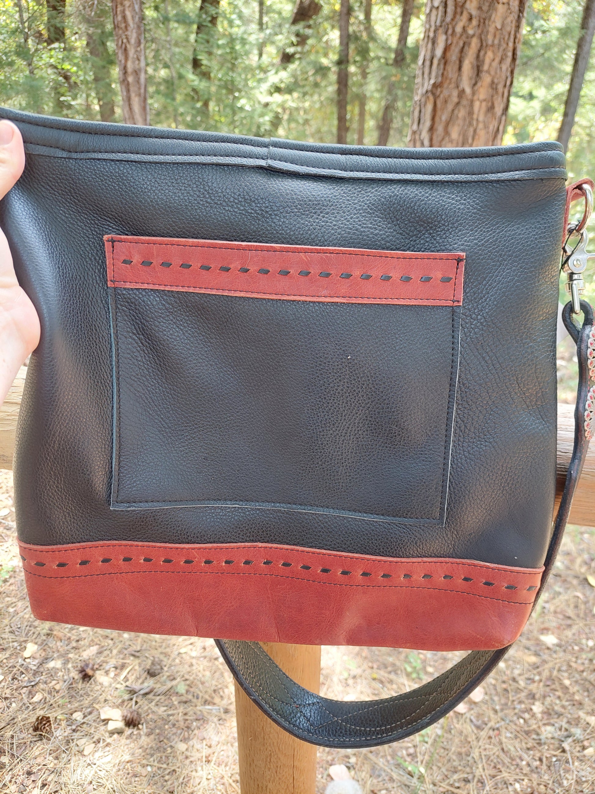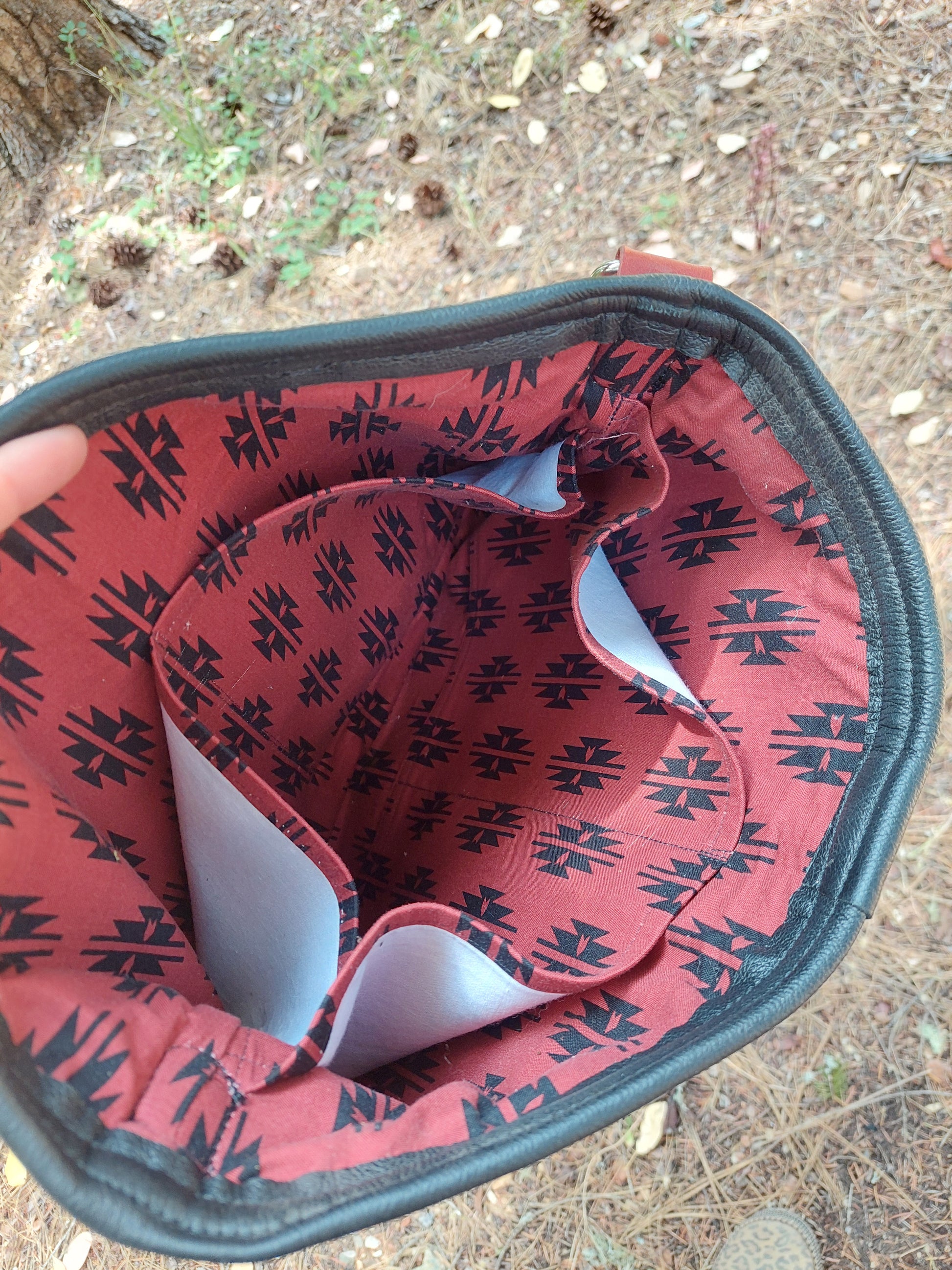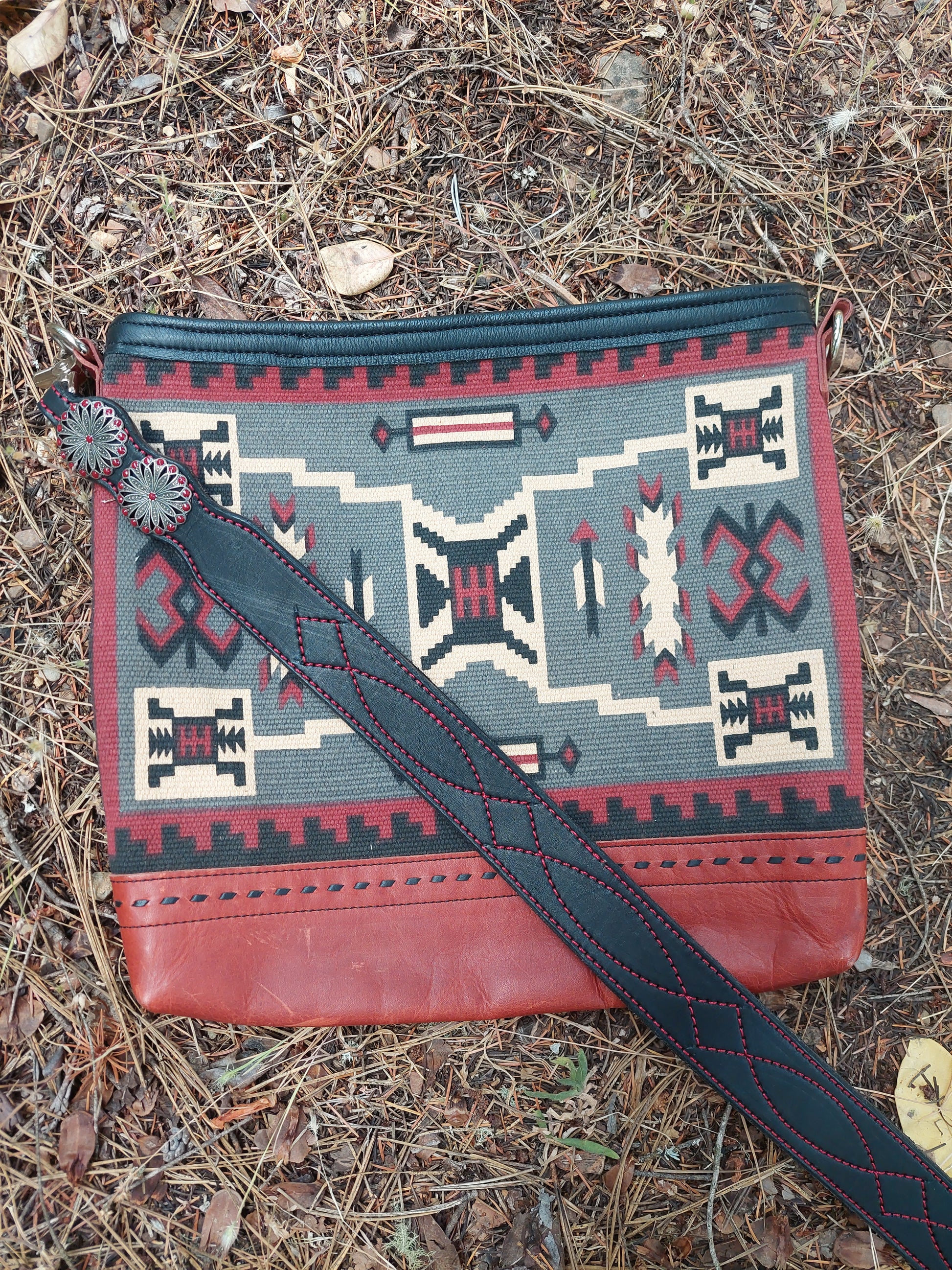 One of a kind, and so neat! Gorgeous Navajo print on the front, plain black leather on the backside. Buckstitch along the bottom. Black crossbody strap with a red gunslinger stitch, and red accented conchos. Strap measures about 40" long, by 1 3/4" wide. Snaps attach the strap. Interior is lined with 4 pockets. Open top.