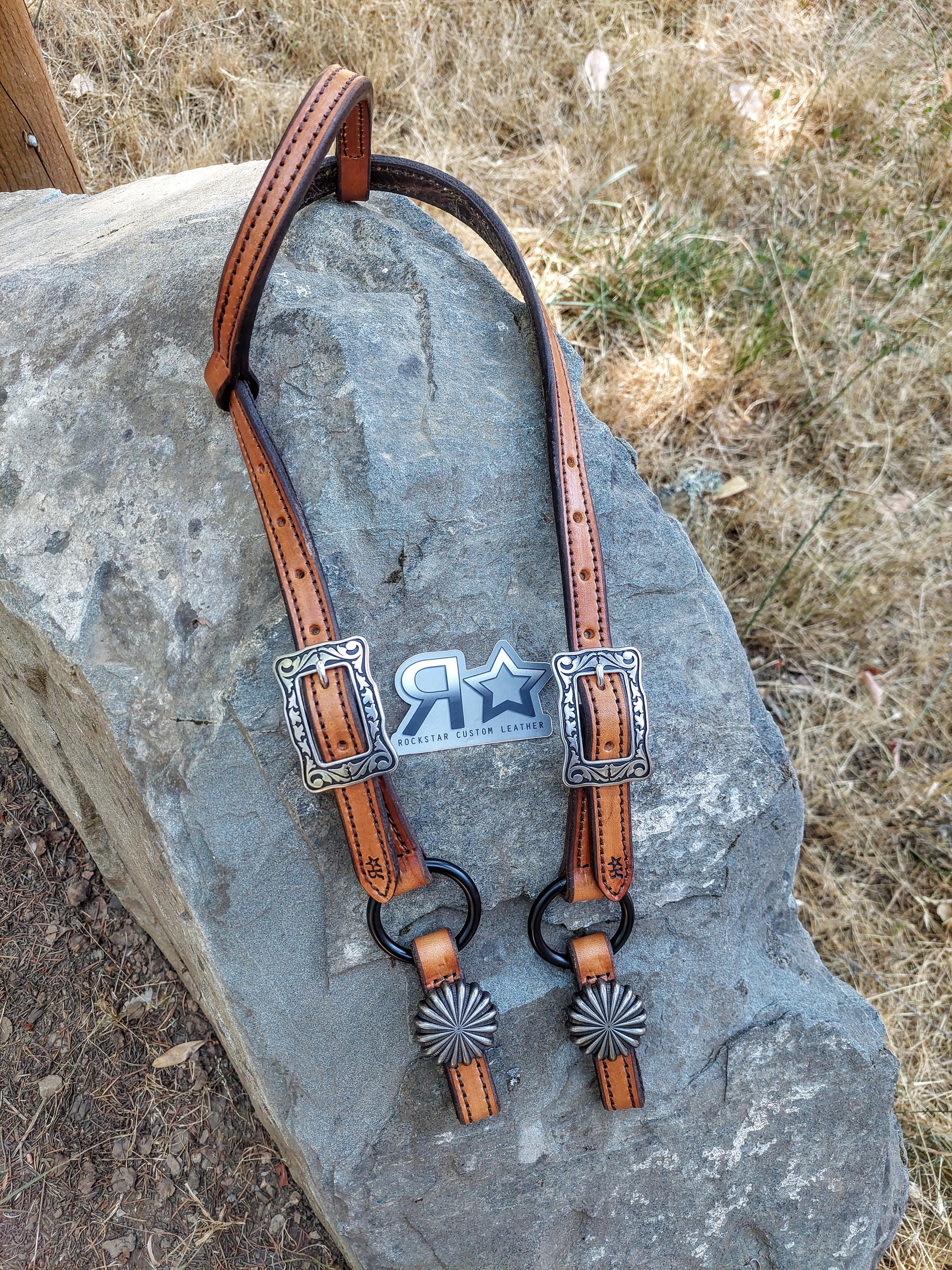 Beautiful, medium oil, one ear headstall with rings. Horseshoe brand buckles. Black rings. Very unique.