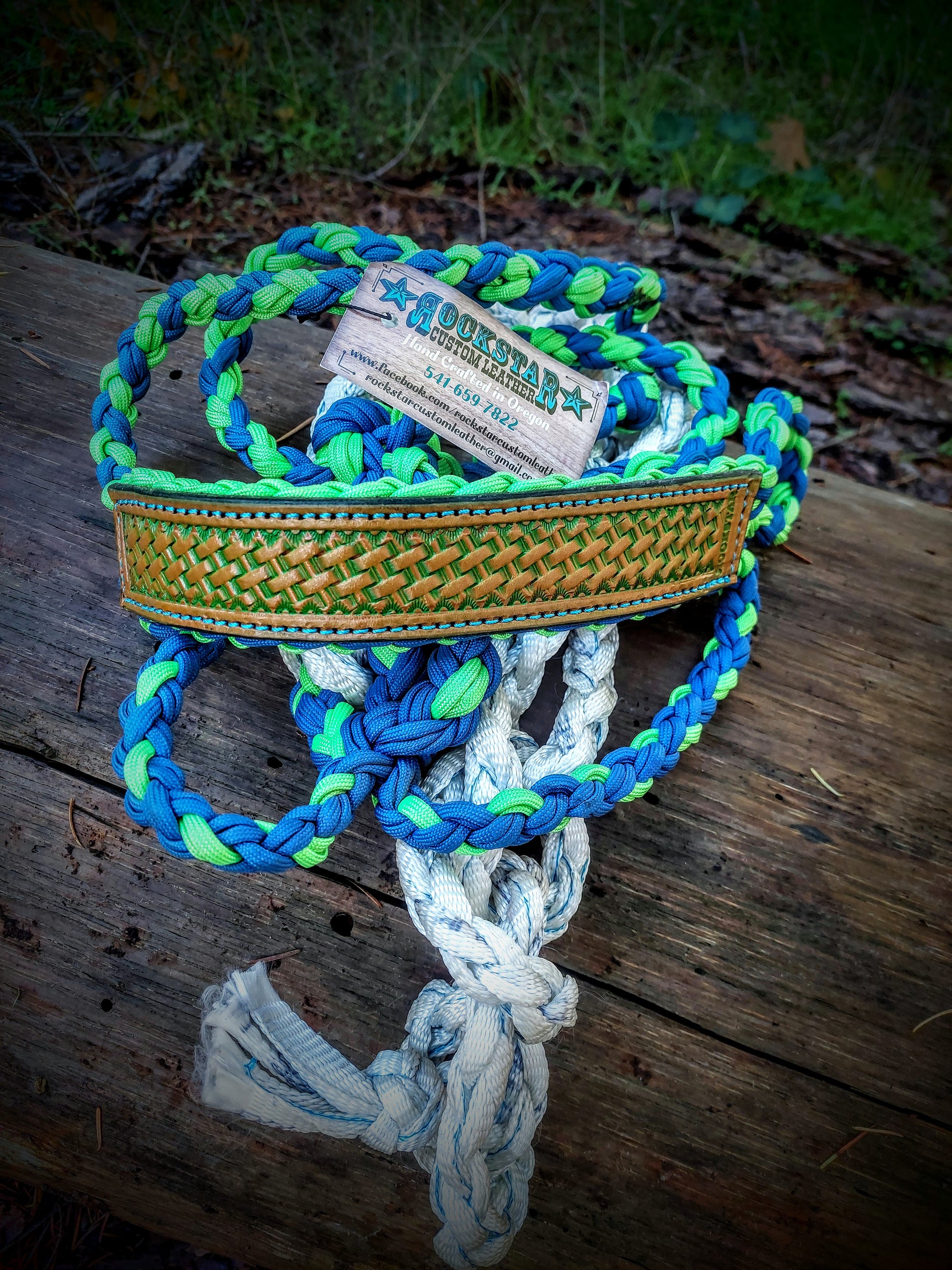 Blue and green paracord braided halter with a muletape lead. Tooled leather noseband with green paint wash.