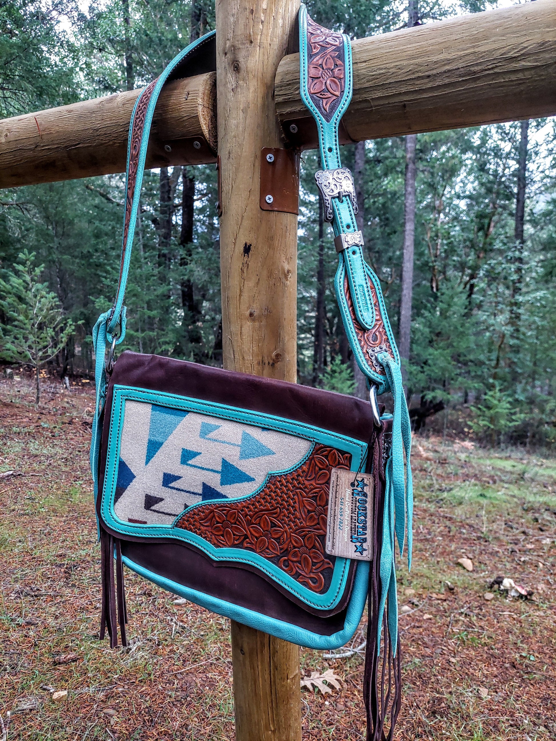 Absolutely gorgeous Pendleton inlay messenger style bag with floral tooling, turquoise accents and fringe. Plain interior. Pocket on the back. Leather is a gorgeous wine color. Measures 11x14. With an adjustable shoulder length tooled leather strap. This one will turn heads!