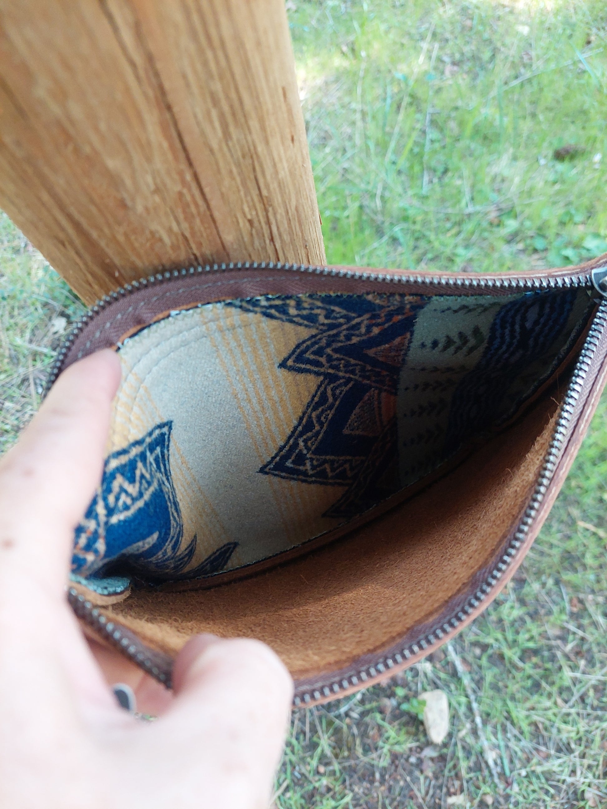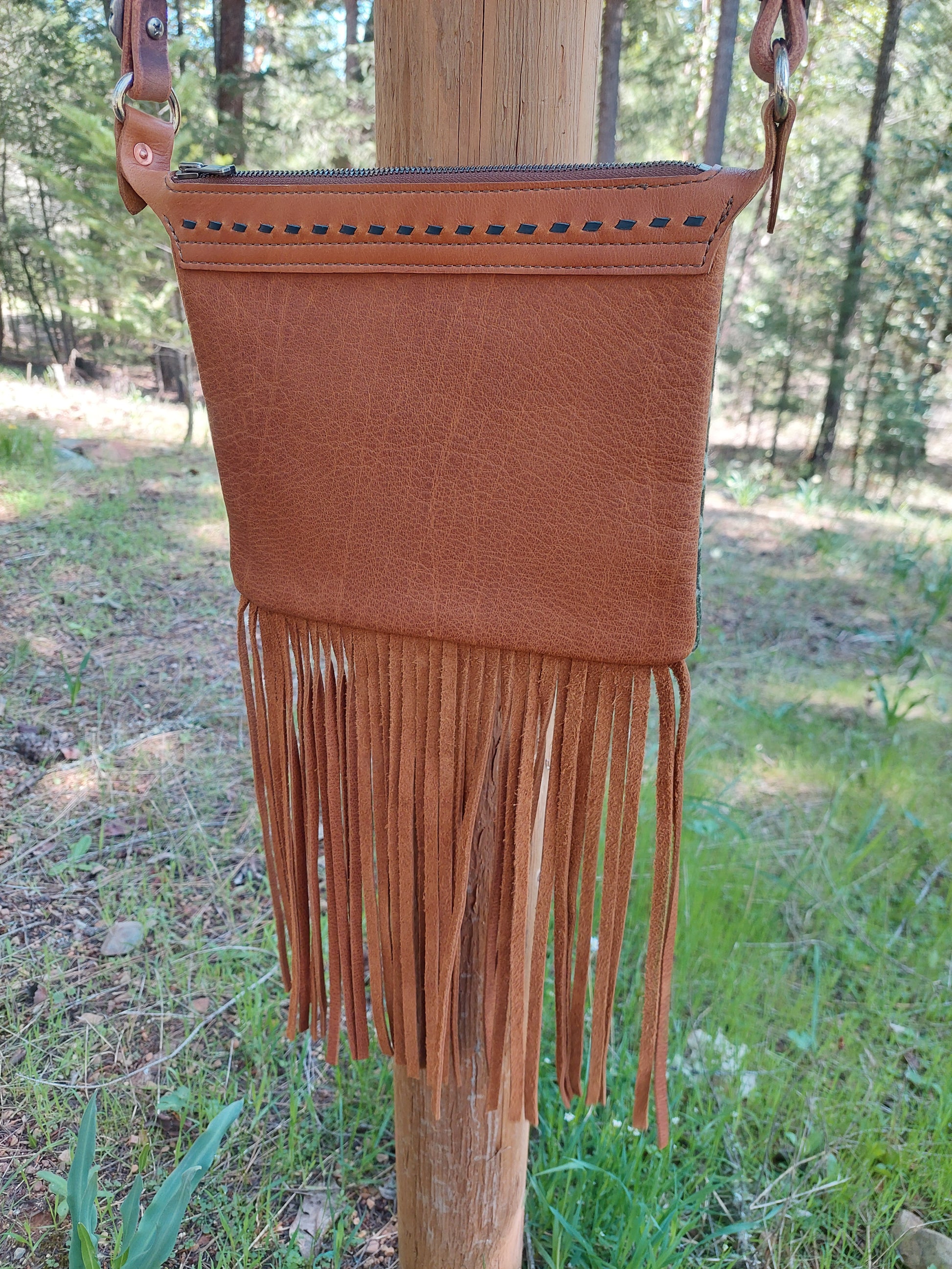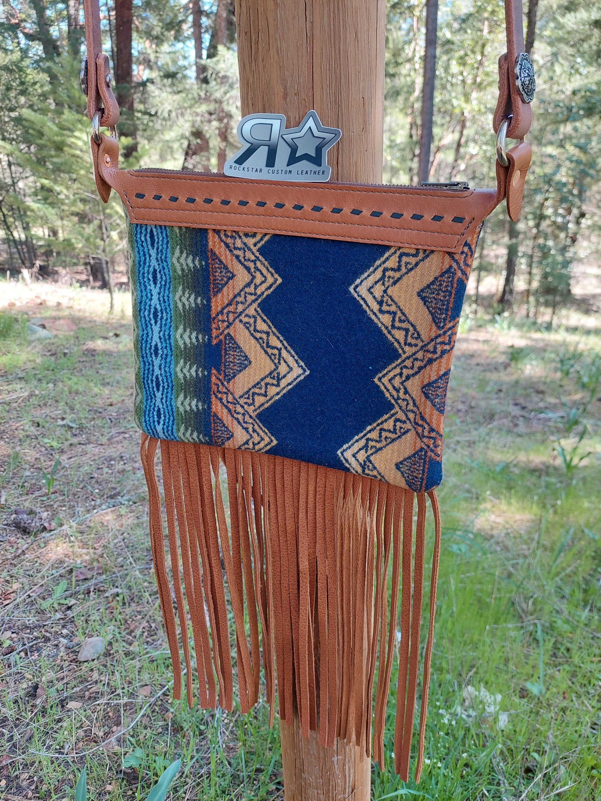 Gorgeous handmade saddle tan brown leather purse, with navy buckstitch along the top. It has genuine Pendleton wool on the front, rustic saddle tan brown 12" fringe along the bottom, and the same color brown on back. Plain, unlined interior. Purse measures about 9.5" wide x 8" tall. 5/8" harness leather strap measures approximately 46" long. Horseshoe brand conchos on the strap. Zip top. Absolutely stunning purse!