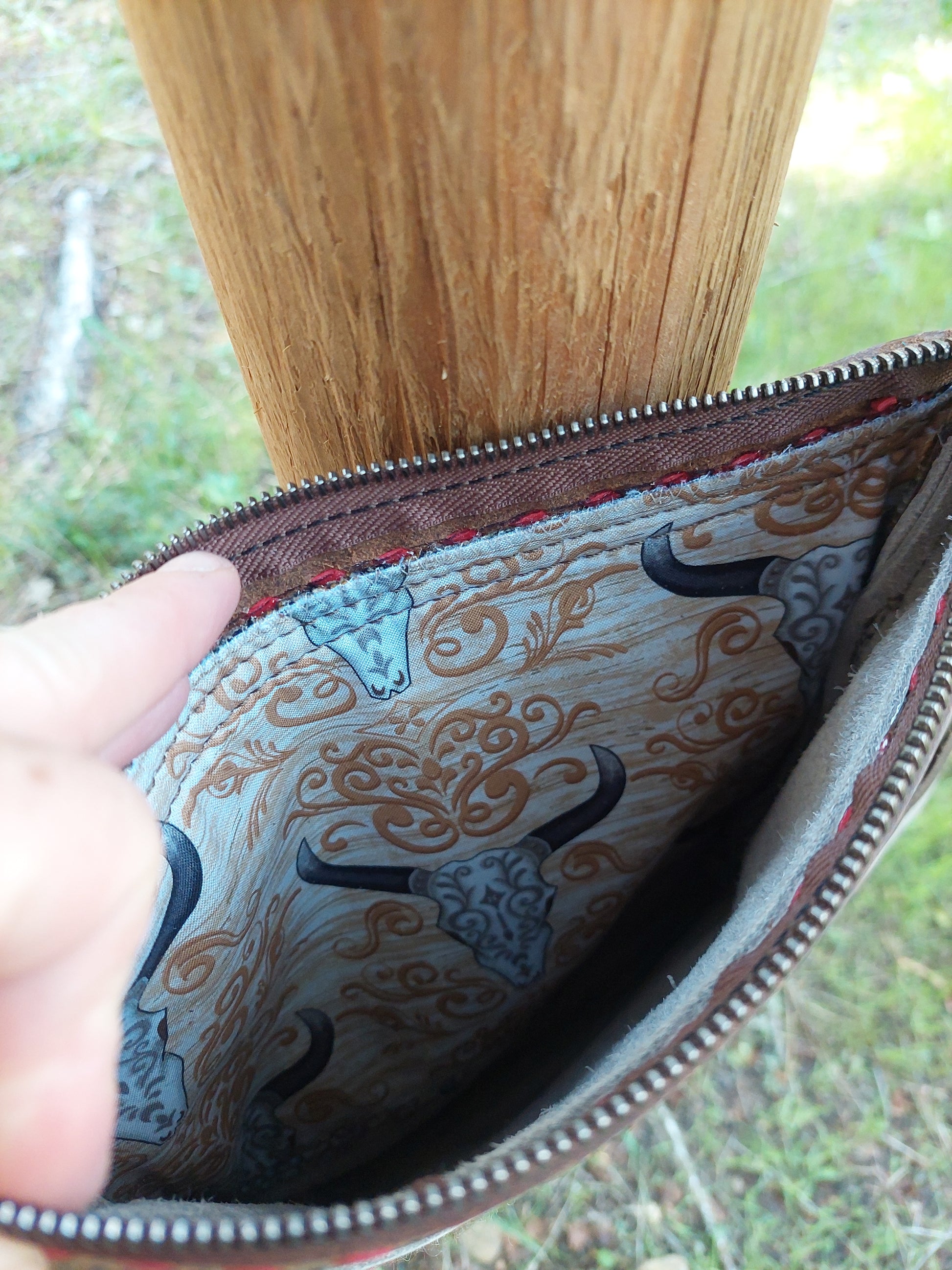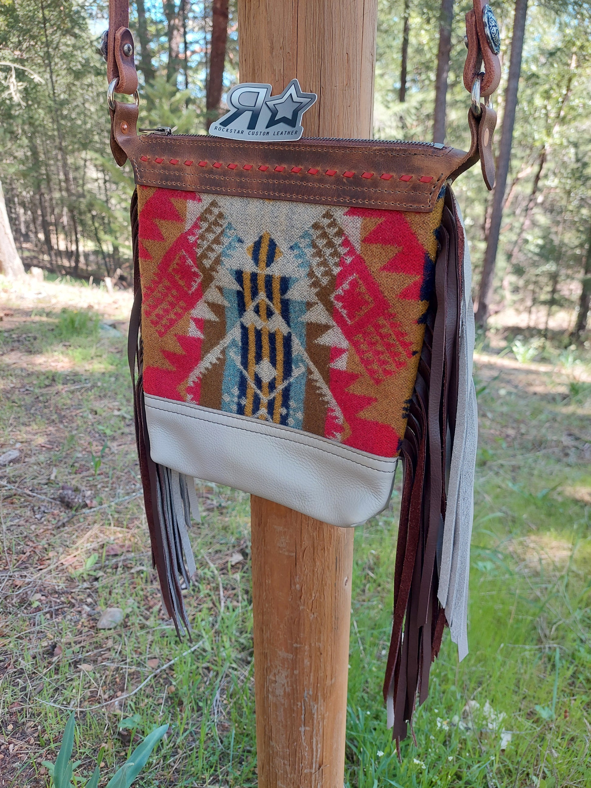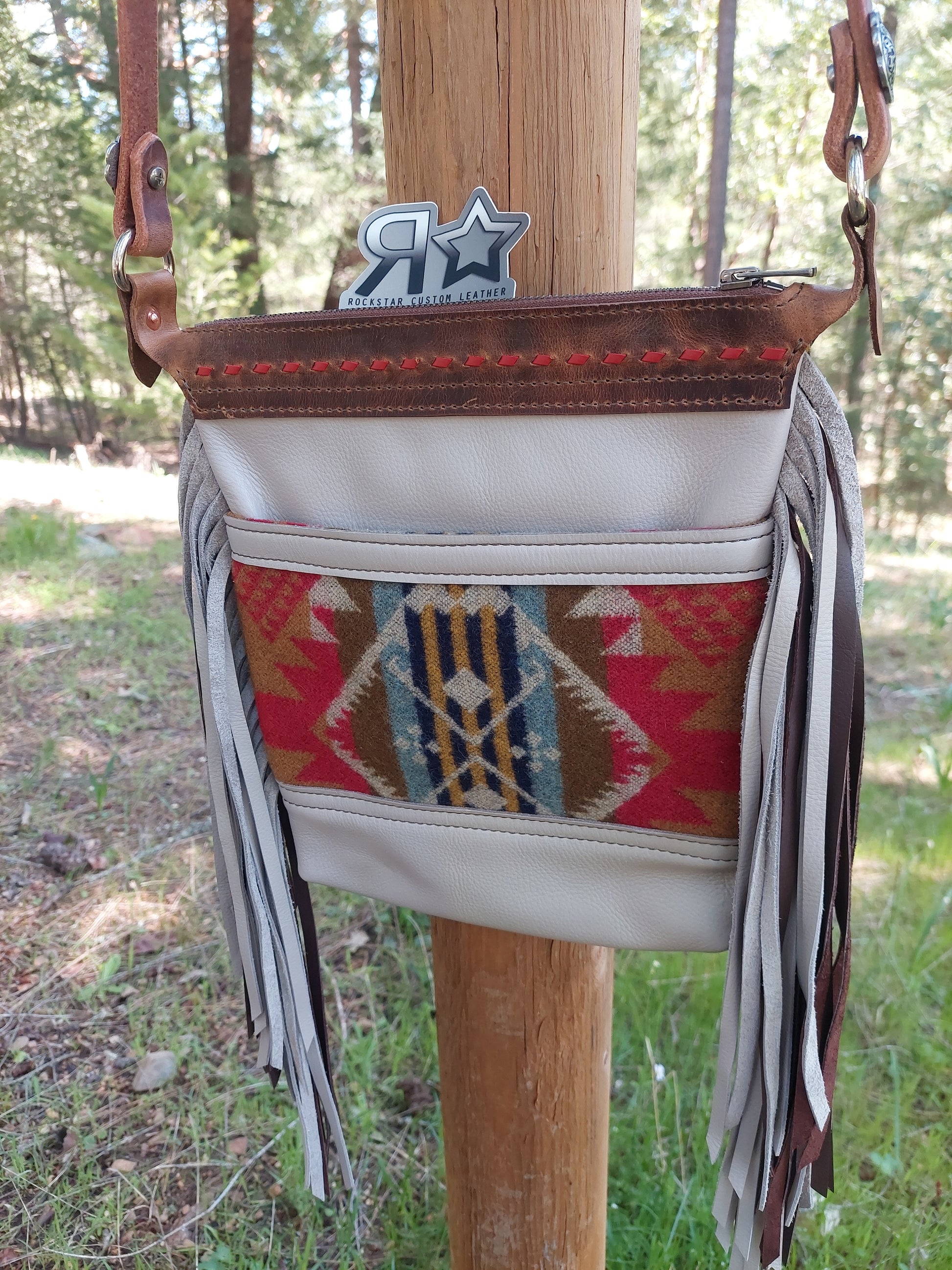 Gorgeous handmade leather purse, with a beautiful rustic brown leather and red buckstitch along the top, and light grey leather along the bottom. It has genuine Pendleton wool on the front, dark chocolate and light grey 11" double layer fringe along the sides. The back has a beautiful Pendleton wool slip pocket that measures 5" deep. It has a super neat cow skull print cotton lined interior along the front side. Purse measures about 9" wide x 11" tall. 5/8" harness leather strap measures approximately 46" long. Horseshoe brand conchos on the strap. Zip top. Absolutely stunning purse!