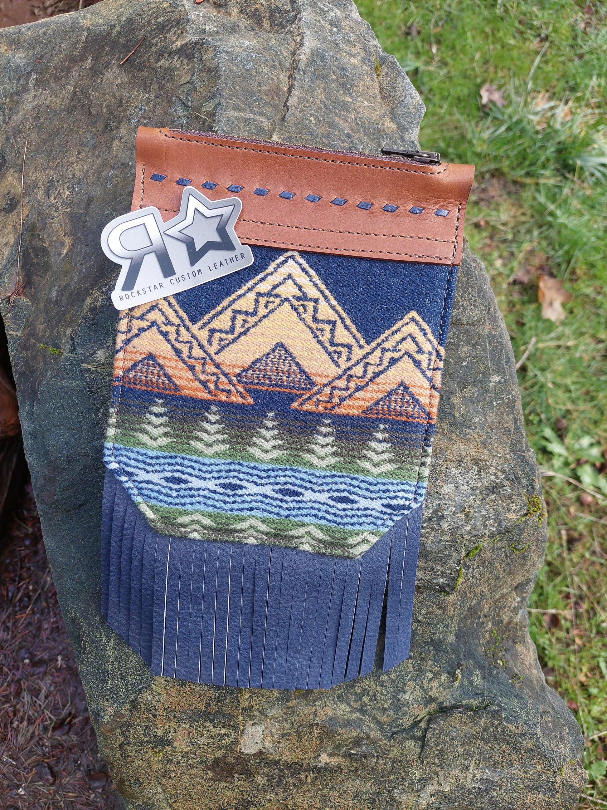 Genuine Pendleton wool front with blue fringe and buckstitch. Zip Top. These are designed to attach to the back cinch tugs on your saddle by slipping through the slot in the back, and then tying at the top. These are made to hold your phones, keys, baby powder, etc. Interior pocket dimensions are approximately 6"x7"