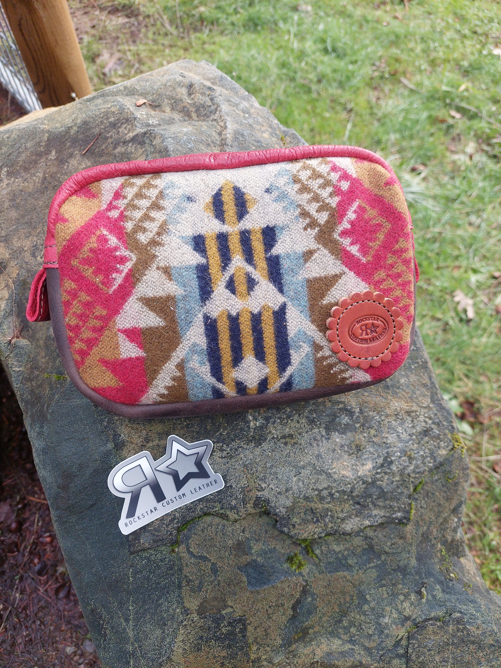 Gorgeous genuine Pendleton wool and leather saddle pommel bag. These are made to buckle around the pommel of your saddle (under the horn) with adjustable nylon straps on the back. Keep your phone, snacks, cash, etc handy and easily accessible while you ride! Approximate dimensions are 8"x6"x1"