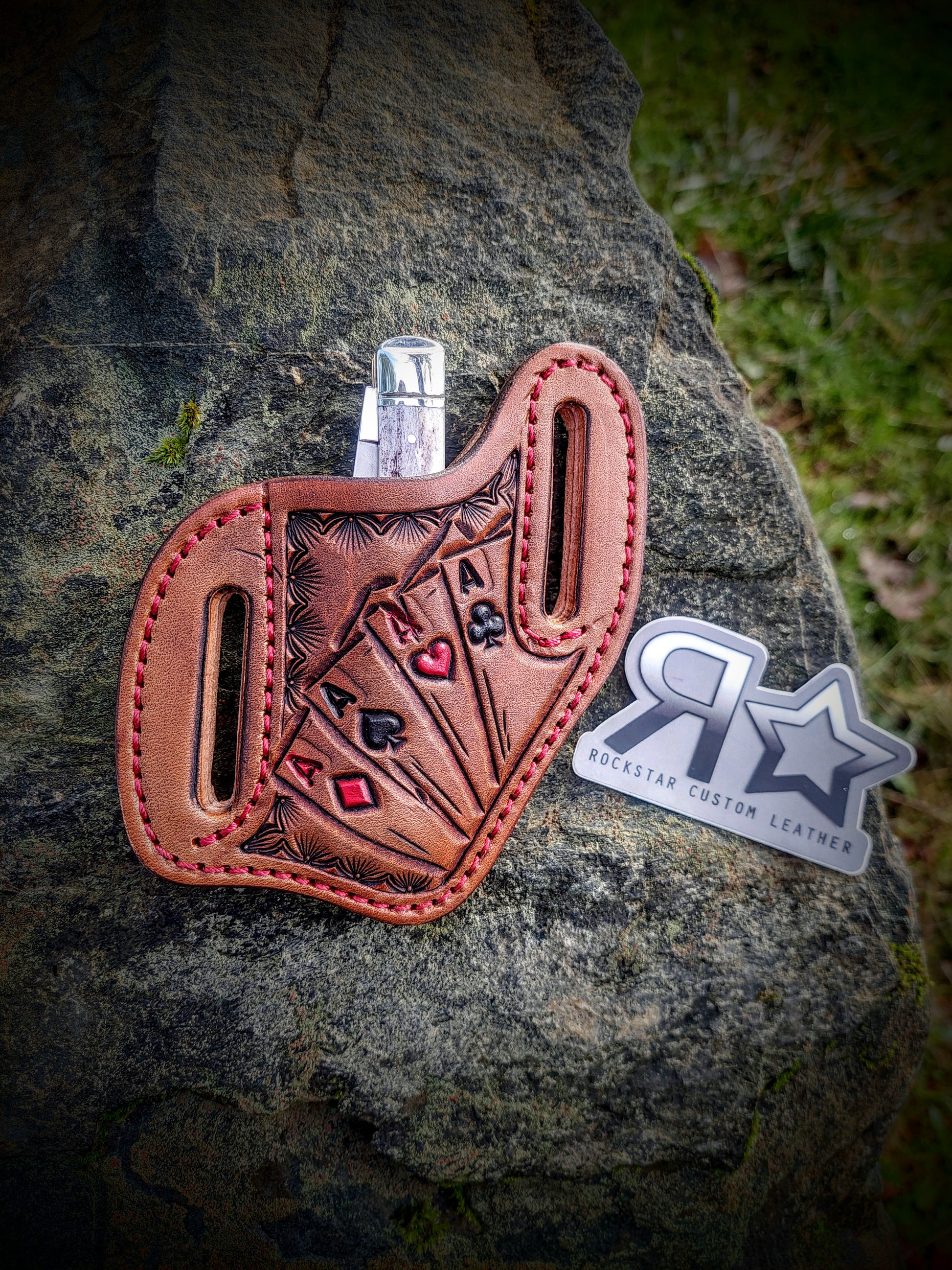 Beautifully tooled knife sheath with a Rough Ryder trapper knife included.