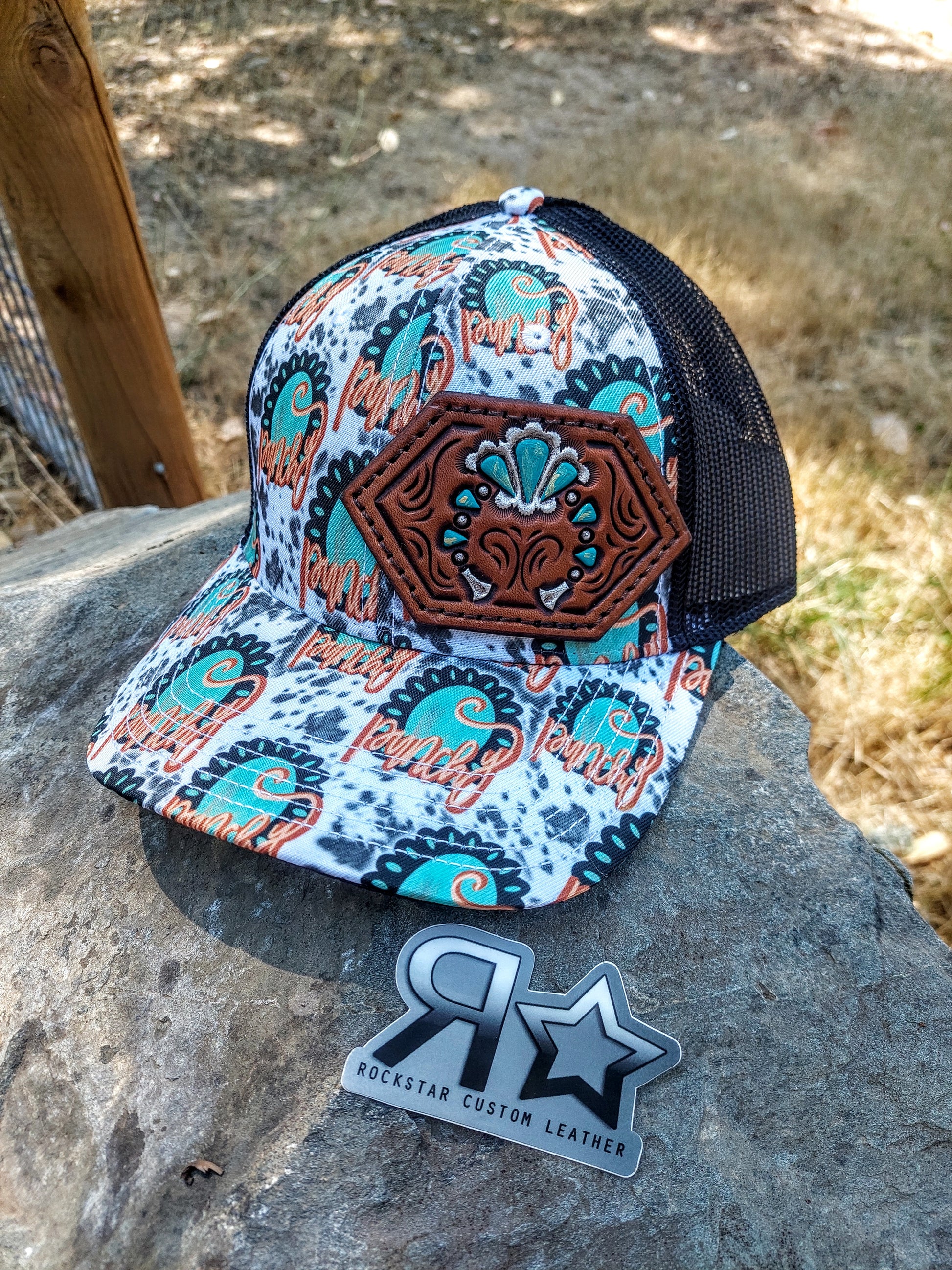 Gorgeous "punchy" printed snapback hat. It has a gorgeous hand tooled, hand painted squash blossom turquoise leather patch.