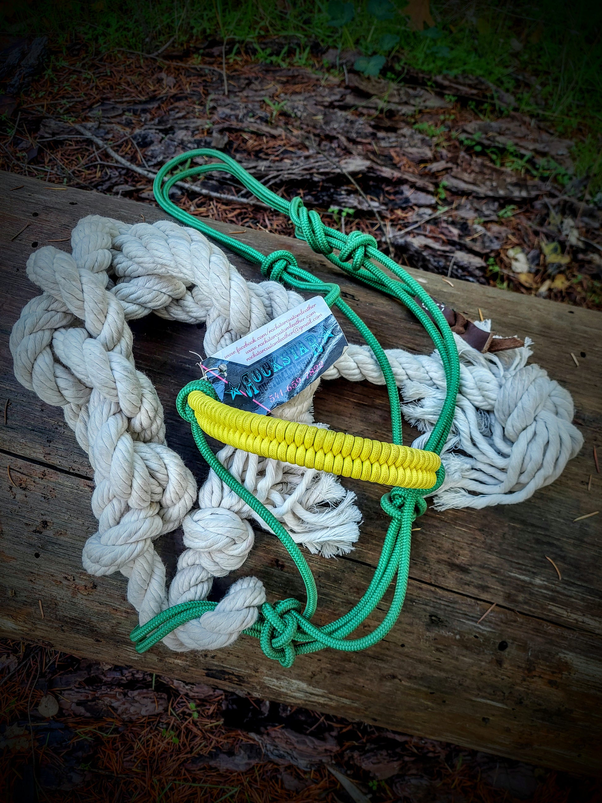 Green rope halter with braided paracord nose in yellow, with a chunky white lead attached