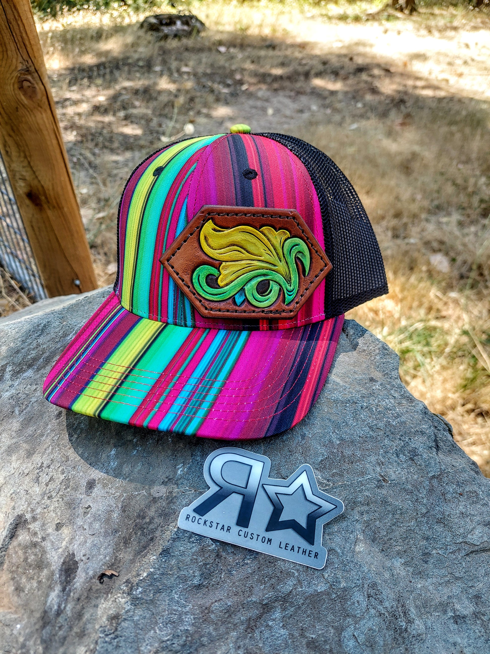 Gorgeous neon serape snapback hat. It has a gorgeous hand tooled, hand painted flower leather patch.