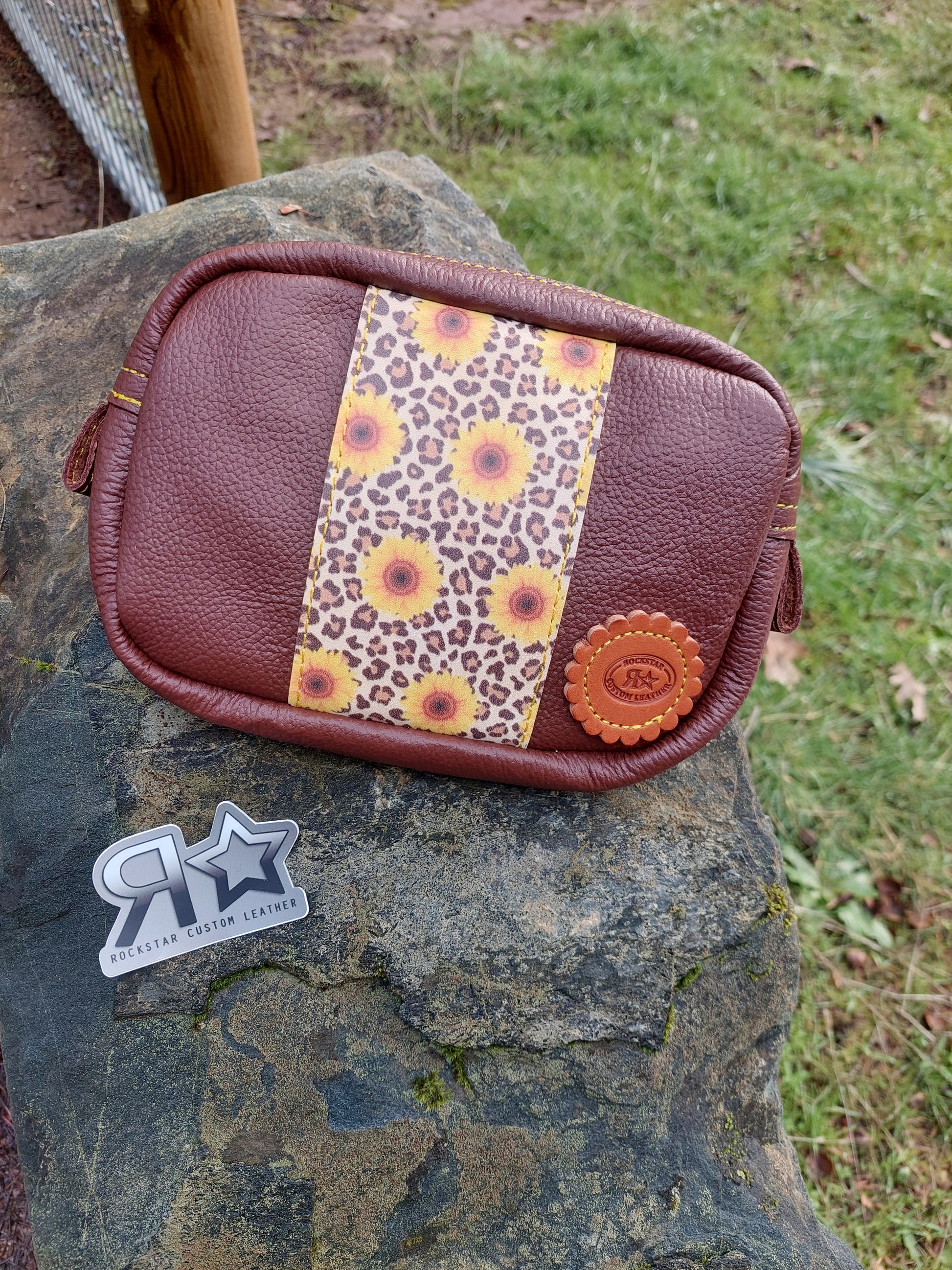 Gorgeous sunflower and cheetah print leather saddle pommel bag. These are made to buckle around the pommel of your saddle (under the horn) with adjustable nylon straps on the back. Keep your phone, snacks, cash, etc handy and easily accessible while you ride! Approximate dimensions are 8"x6"x1"