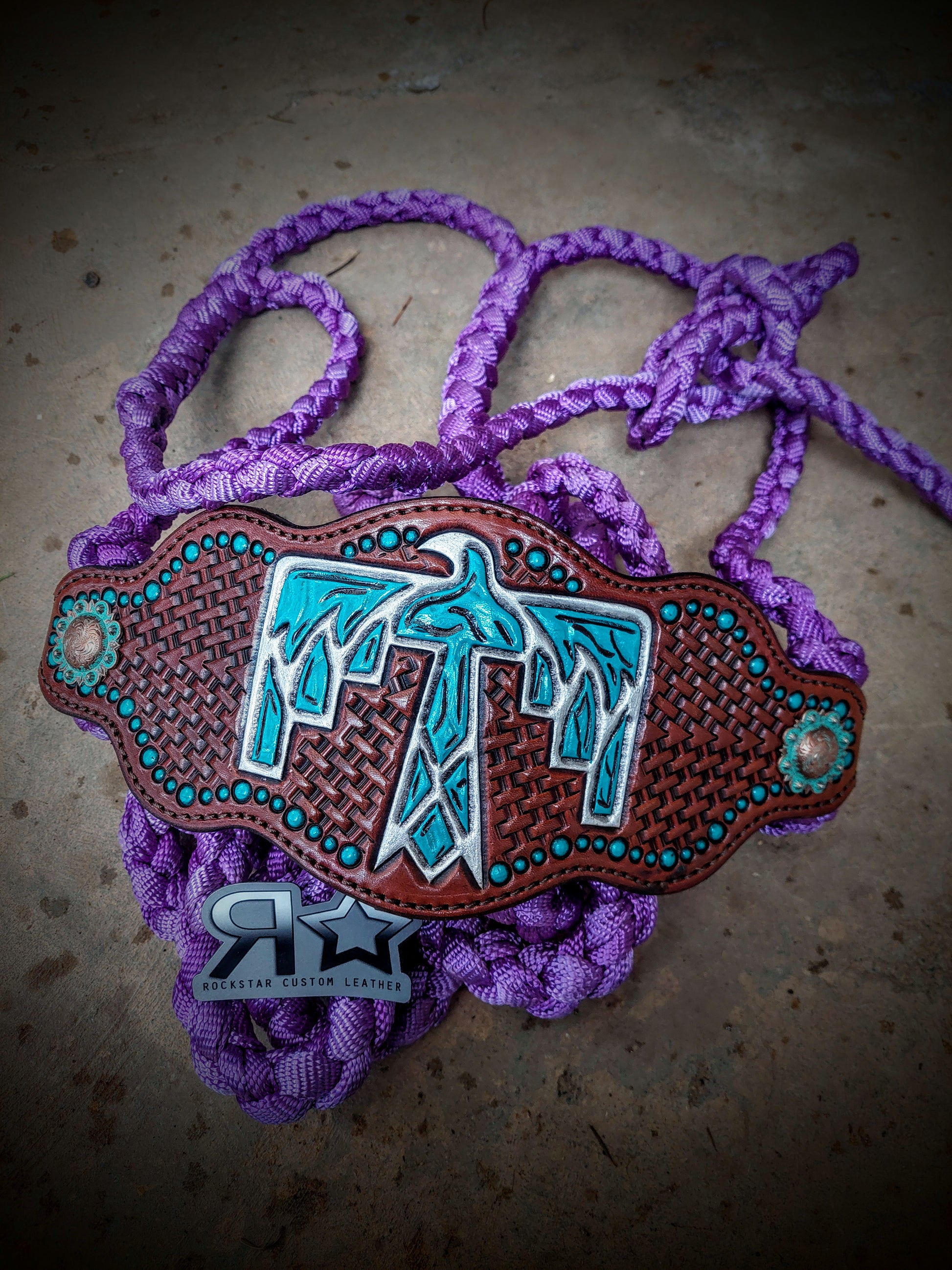 Absolutely gorgeous purple muletape halter with a removable tooled turquoise stone thunderbird bronc noseband! Attached lead rope (removable). This one is SO PRETTY! Pictures don't do it justice!