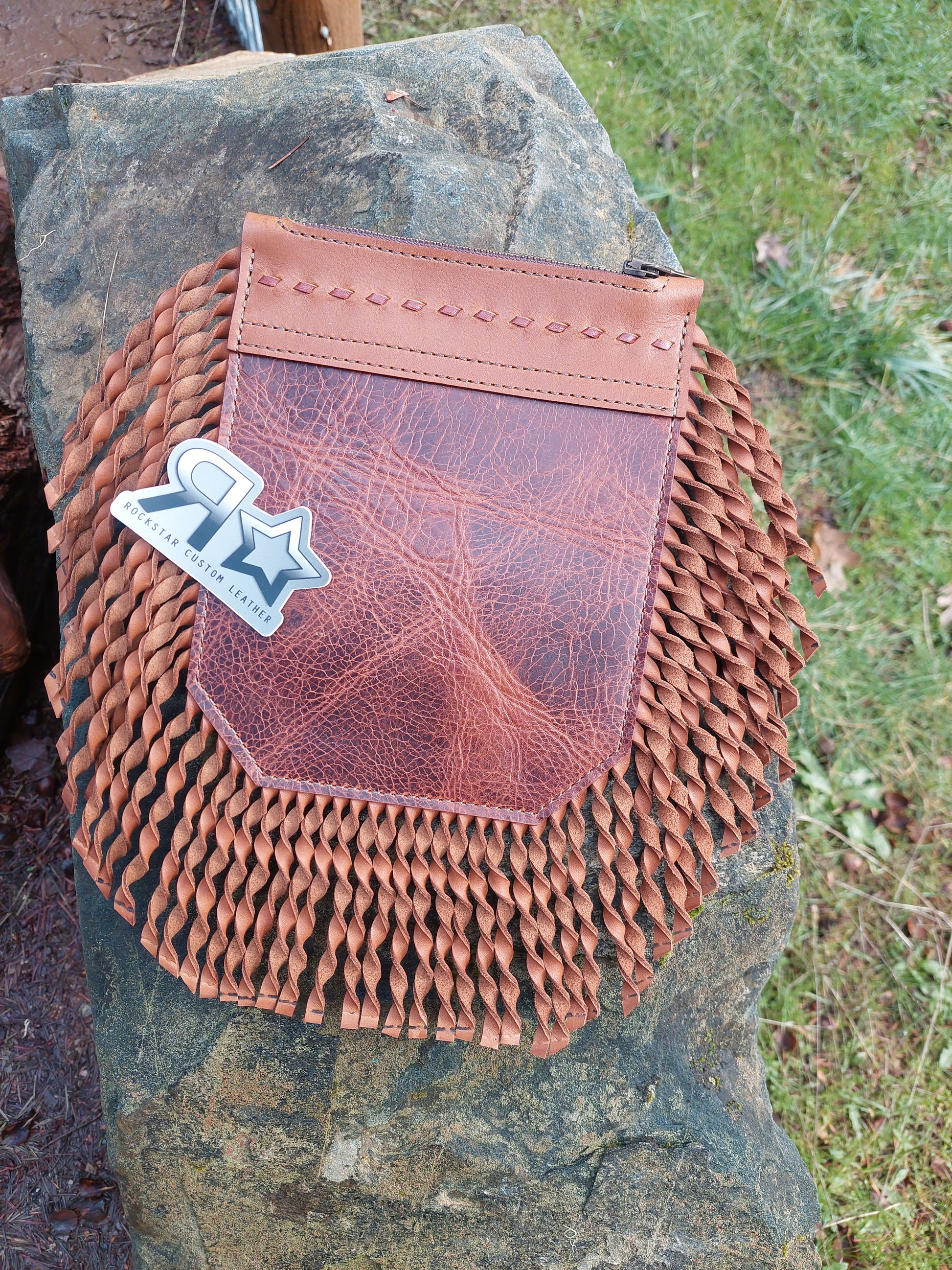 Absolutely beautiful milk chocolate twisted fringe and buckstitch. Zip Top. These are designed to attach to the back cinch tugs on your saddle by slipping through the slot in the back, and then tying at the top. These are made to hold your phones, keys, baby powder, etc. Interior pocket dimensions are approximately 6"x7"
